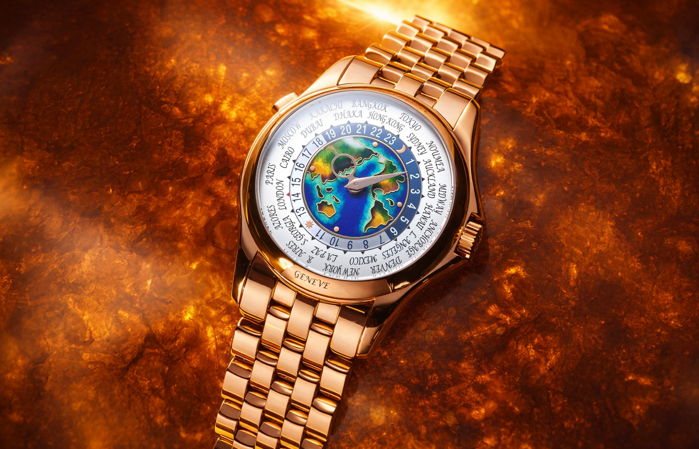 Una dintre cele mai pure interpretări ale acestei complicații este oferită de Patek Philippe World Time în varianta din aur alb cu cadran din email. Acest tip de ceas are la bază mecanismul dezvoltat de Louis Cottier și combină complexitatea tehnică cu un nivel extrem de ridicat de execuție artistică. Cadranul din email, realizat manual, transformă ceasul într-o piesă care depășește funcția utilitară.
