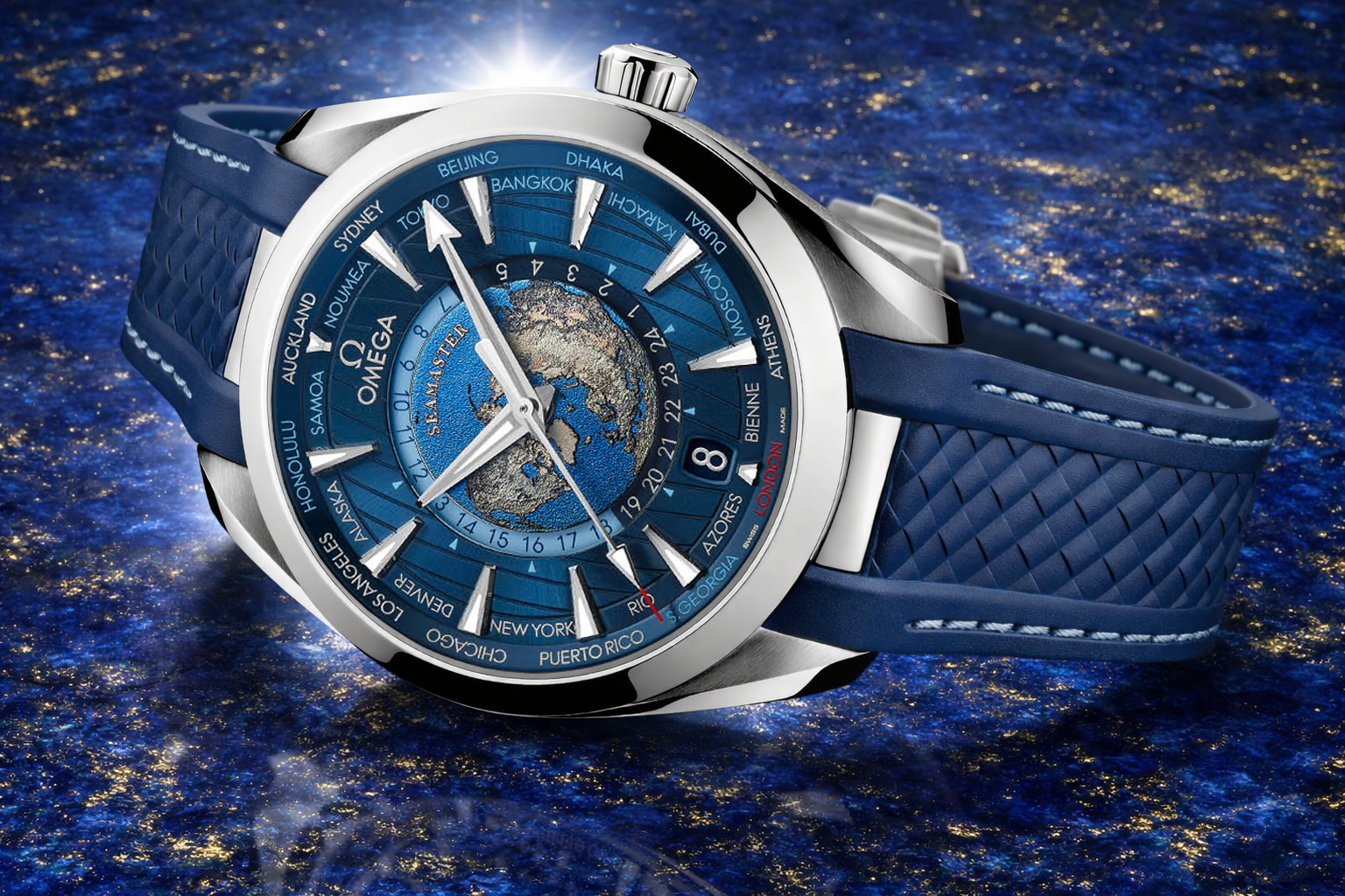 Într-o zonă mai contemporană, Omega Seamaster Aqua Terra Worldtimer oferă o interpretare modernă și mult mai accesibilă. Harta globului este redată în centrul cadranului, iar contrastul dintre zonele de zi și noapte este foarte clar, ceea ce face citirea rapidă și intuitivă. Este un worldtimer gândit pentru utilizare zilnică, nu doar pentru colecție.