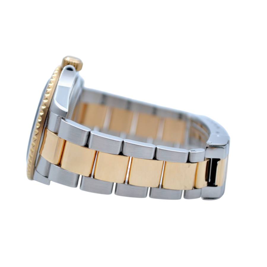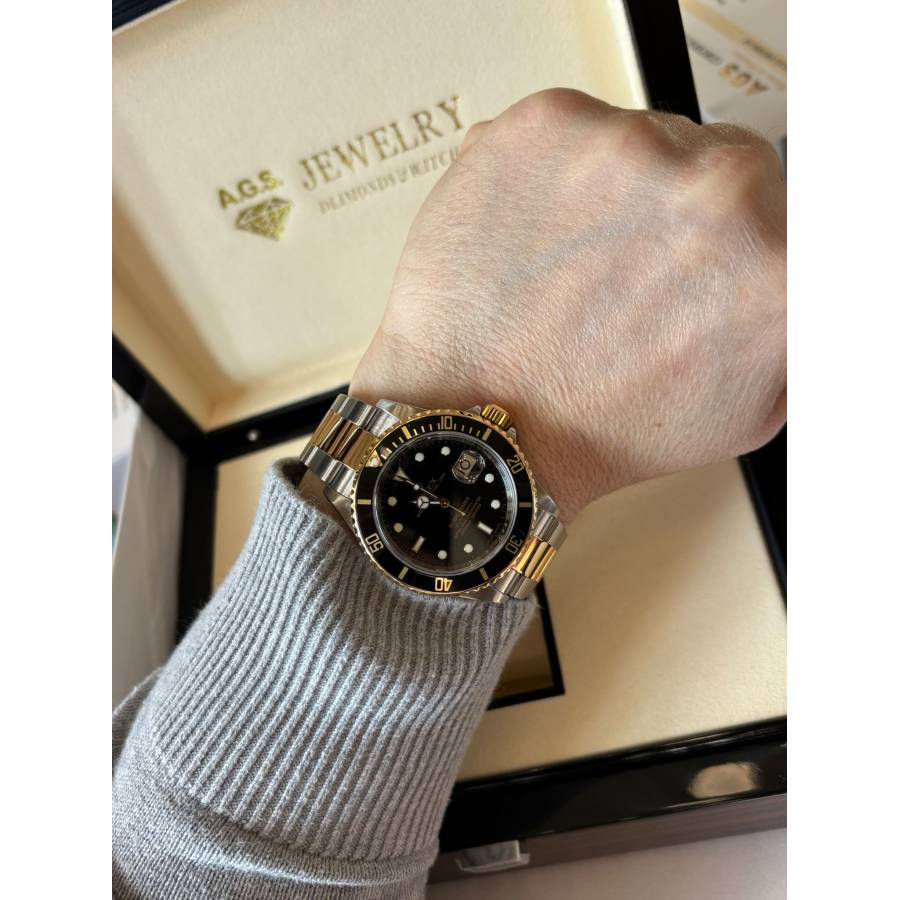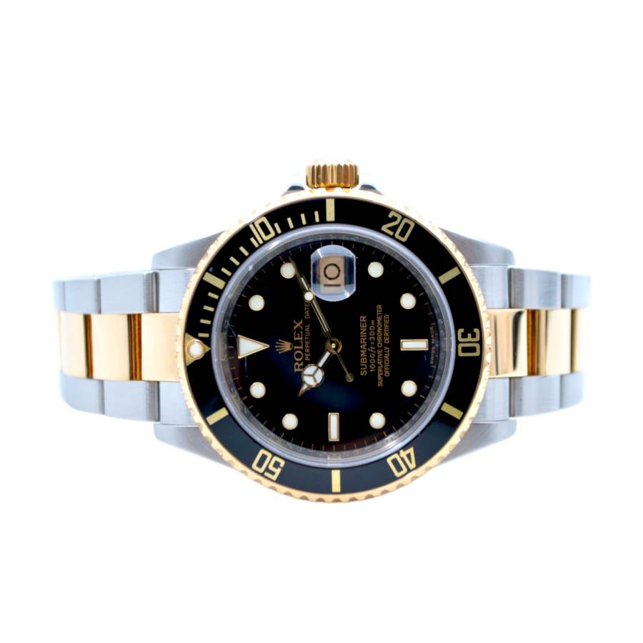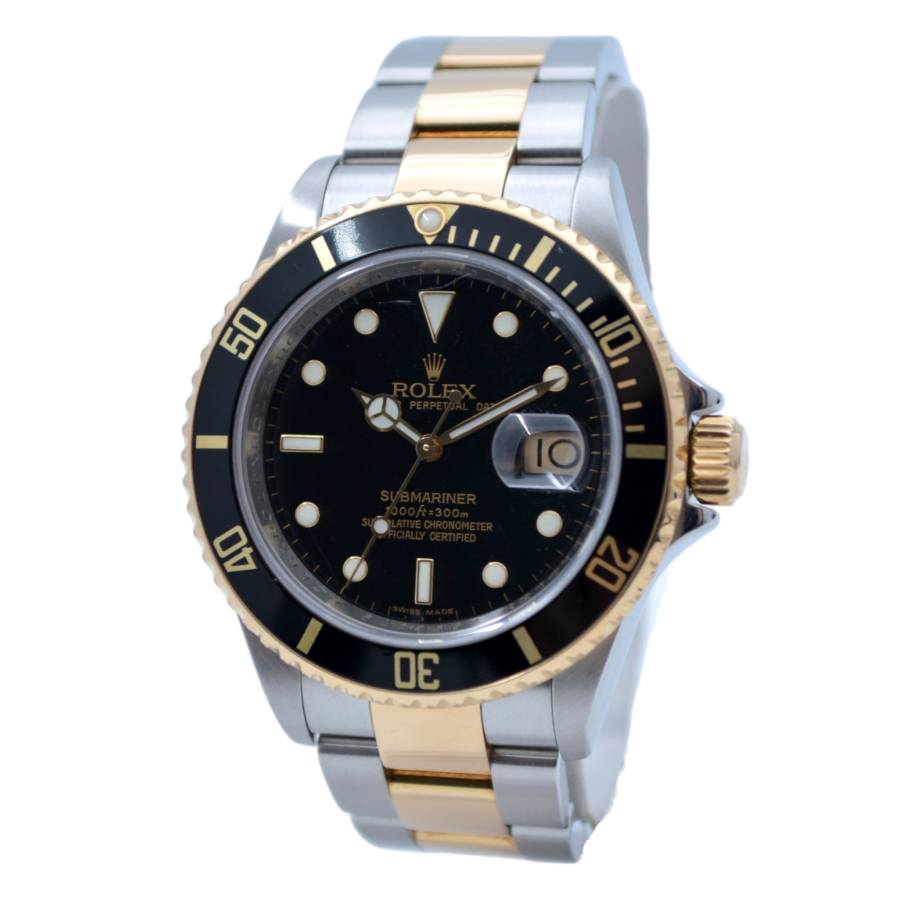 Rolex Submariner ref. 16613T cu cadran negru este un exemplu clasic al liniei Submariner bicolore produse de Rolex de la sfârșitul anilor 1980 până în anii 2000. Ceasul combină oțelul inoxidabil cu aur galben de 18k pe lunetă, coroană și legăturile centrale ale brățării, o configurație adesea numită „Rolesor”. Denumirea „T” se referă la stilul ulterior al cadranului și lunetei, introduse în jurul anului 2000, cu marcaje orare mai mari umplute cu material luminos și un ghiul de acul mai gros, cu contur auriu, care îmbunătățește lizibilitatea sub apă. Acesta păstrează luneta de scufundare unidirecțională din aluminiu negru, cu o scală de 60 de minute, și este acționat de mecanismul automat fiabil Caliber 3135, cunoscut pentru durabilitate și cronometrare stabilă.