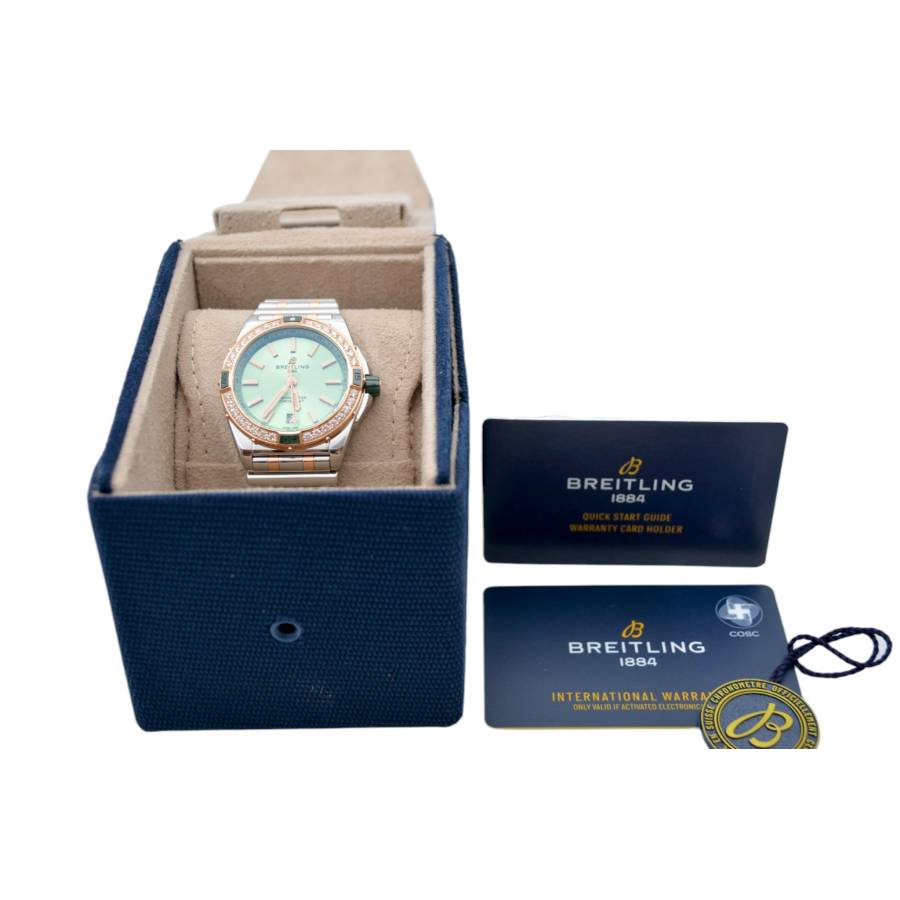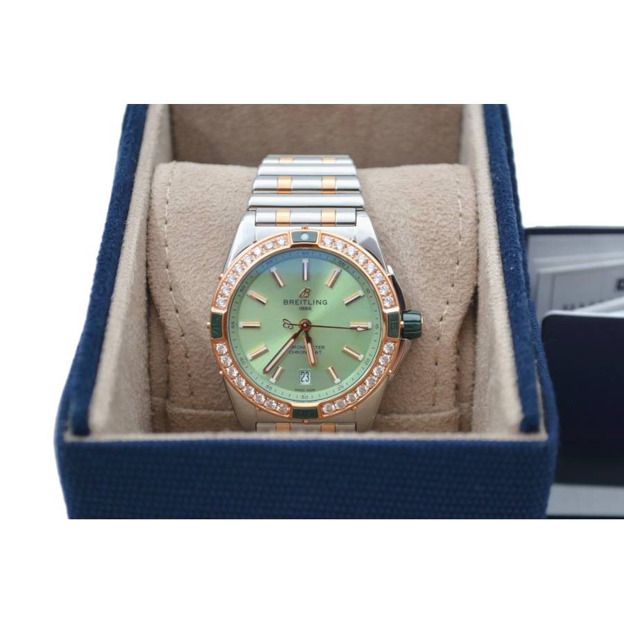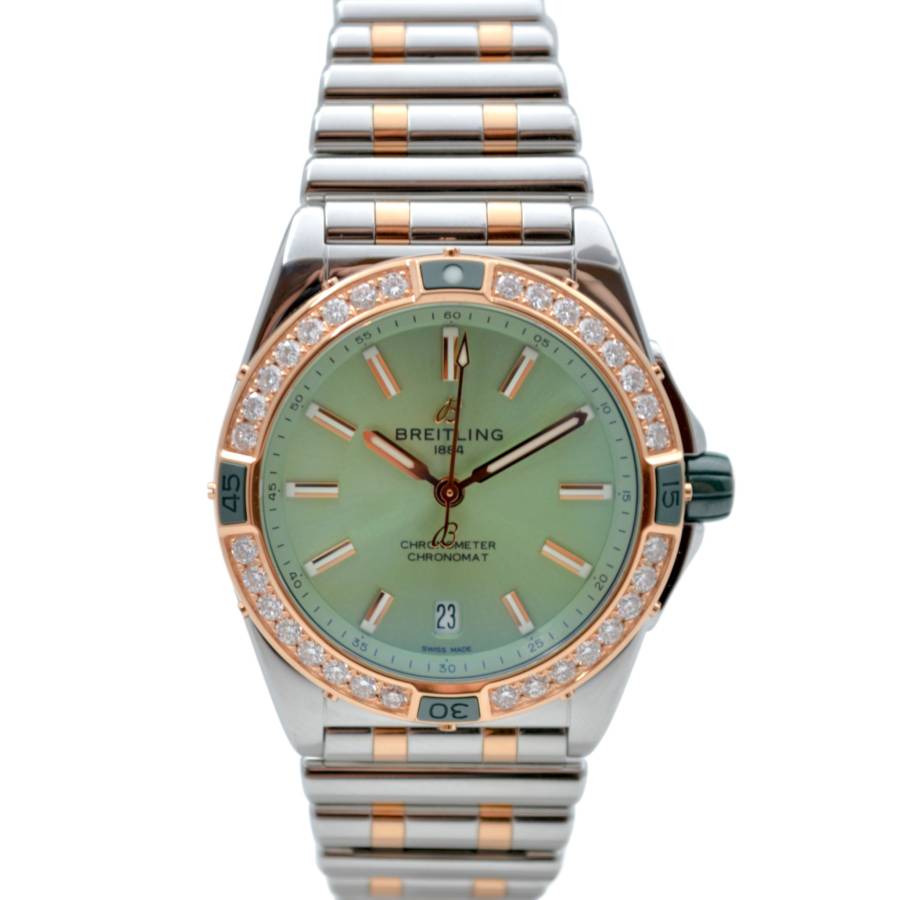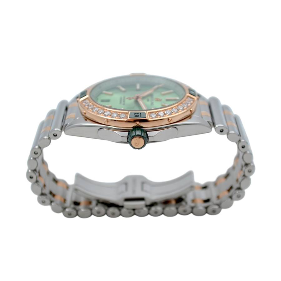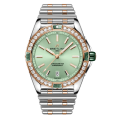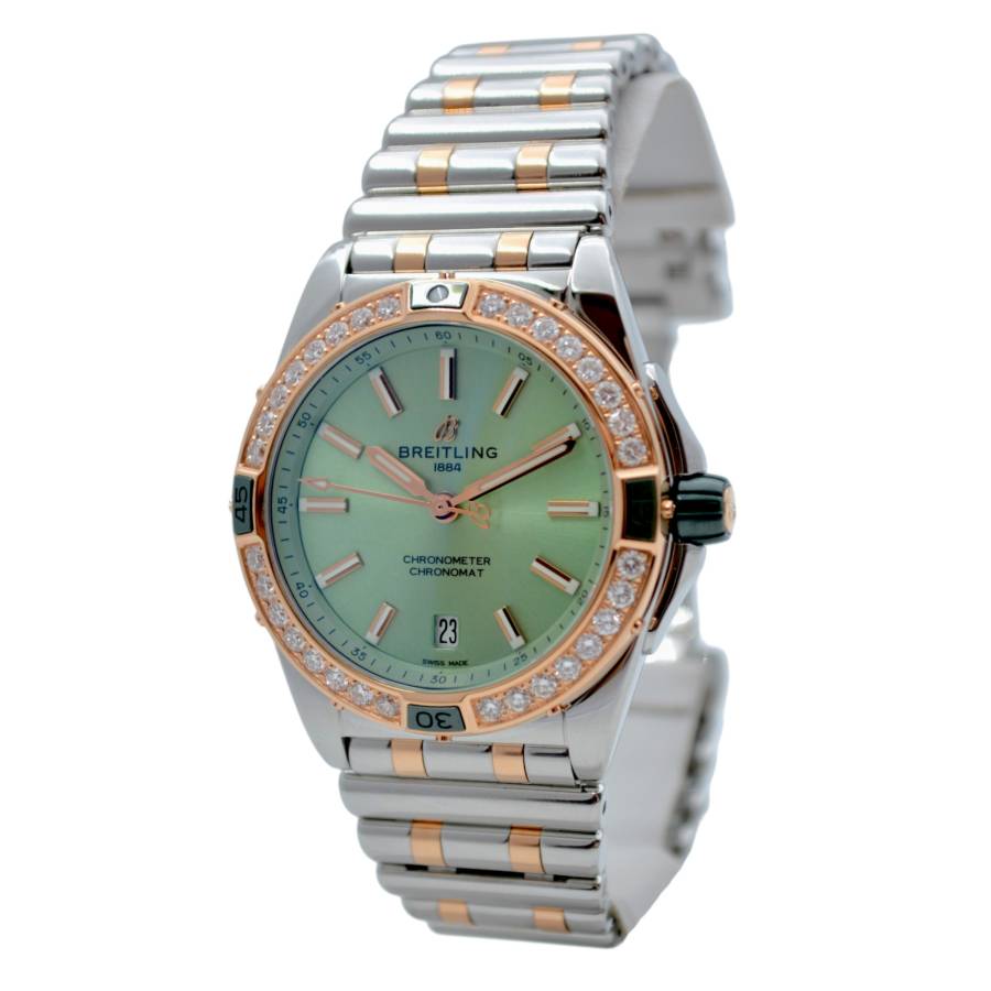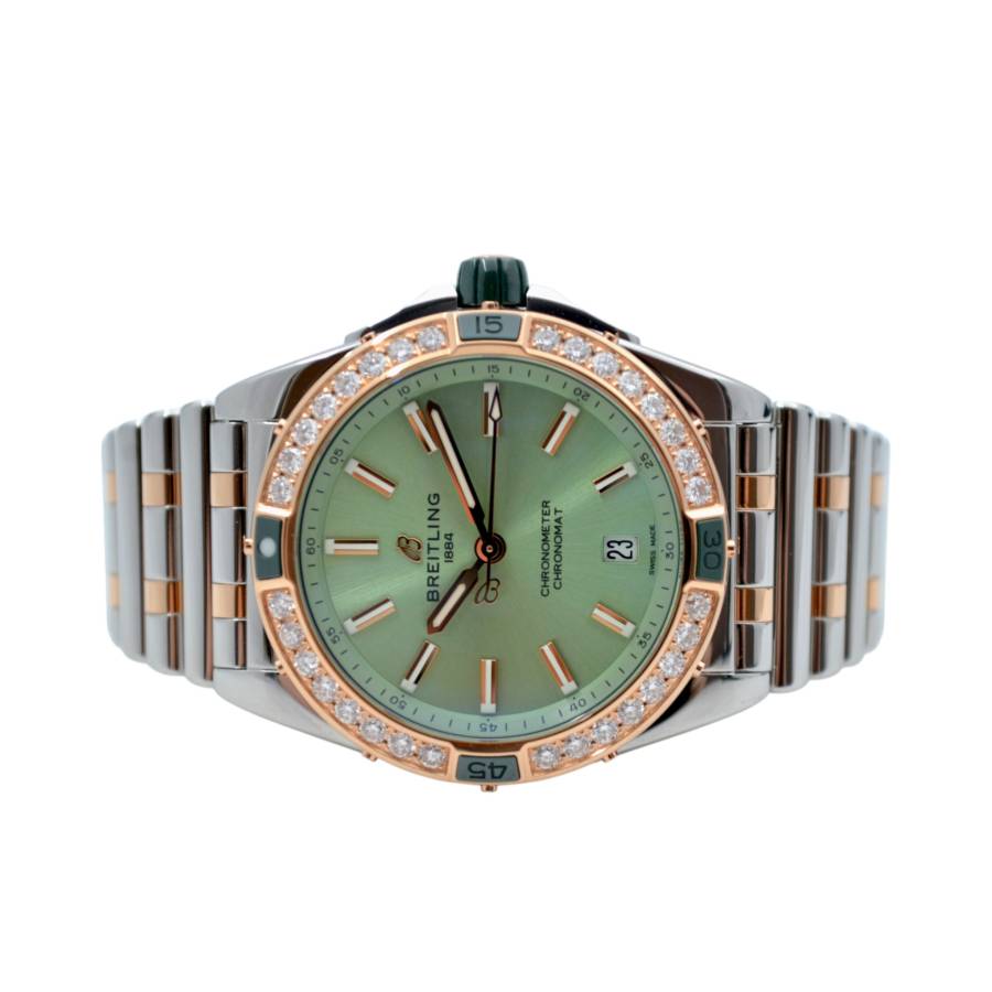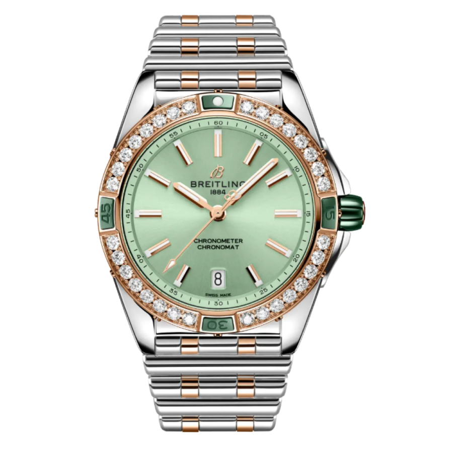 La prima vedere, cadranul verde-mentă radiant pare proaspăt, vibrant, aproape viu - o culoare neașteptată care transformă ceasul într-o adevărată piesă emblematică. Înconjurându-l, o lunetă încrustată cu diamante cultivate în laborator strălucește cu o intensitate rafinată, perfect echilibrată de căldura aurului roșu de 18k și rezistența oțelului inoxidabil. Această dualitate - lux și robustețe - este în centrul Breitling. Brățara Rouleaux, unul dintre cele mai emblematice elemente din linia Chronomat, învăluie încheietura mâinii cu un confort fluid și o identitate inconfundabilă.