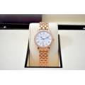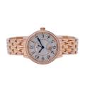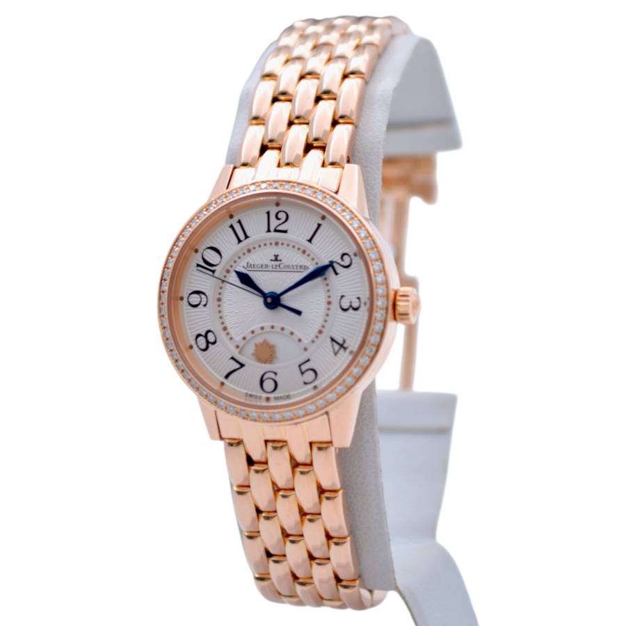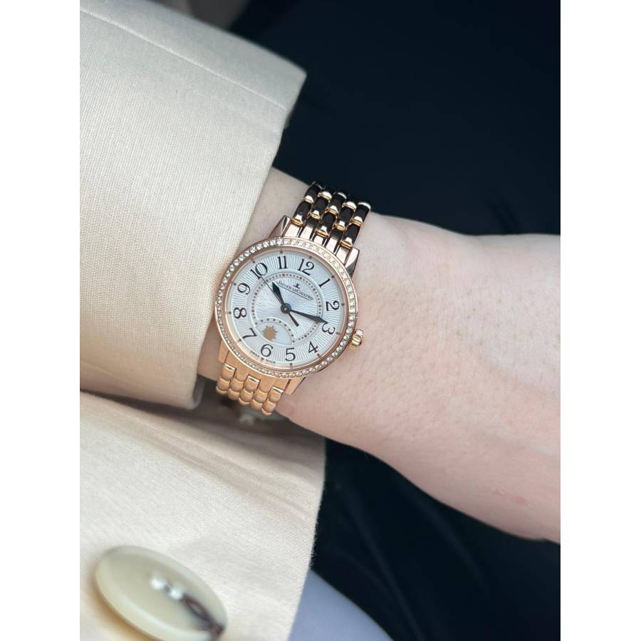 Jaeger-LeCoultre Rendez-Vous 346.2.56.S este un ceas elegant de lux pentru femei, care reflectă moștenirea rafinată în orologerie a Jaeger-LeCoultre. Parte a sofisticatei colecții Rendez-Vous, acest model prezintă o carcasă compactă de 29 mm, realizată în aur roz, asociată cu un cadran delicat împodobit cu indicatori orari arabi și o lunetă încrustată cu pietre prețioase care îi sporesc caracterul feminin și luxos. Ceasul este acționat de un mecanism mecanic automat, demonstrând reputația mărcii pentru precizie și măiestrie. Un indicator distinctiv zi-noapte la ora 6 adaugă atât farmec vizual, cât și funcționalitate practică, permițând purtătorului să distingă cu ușurință între zi și noapte.