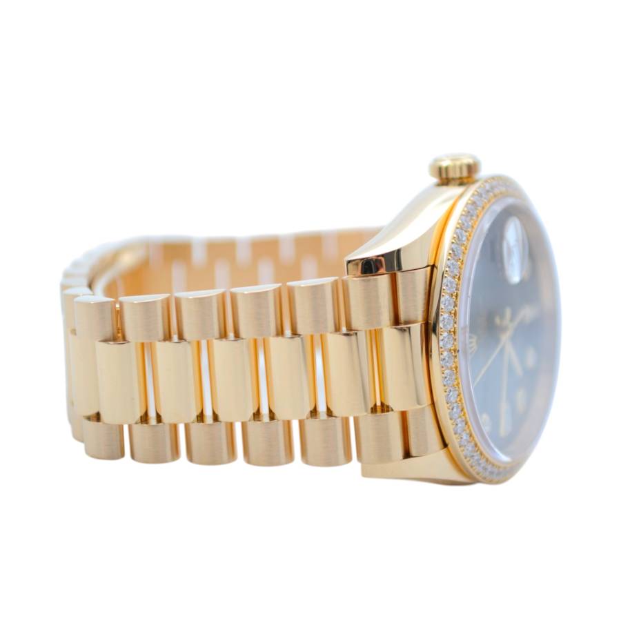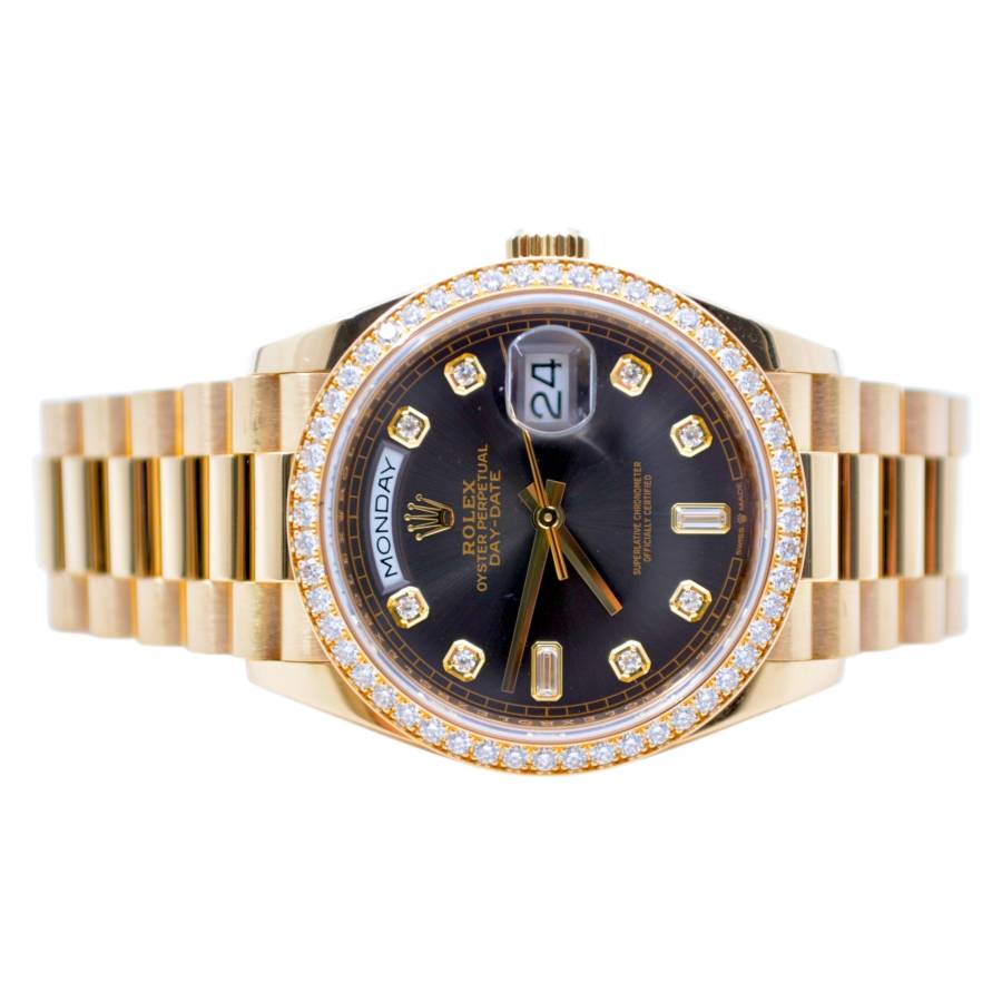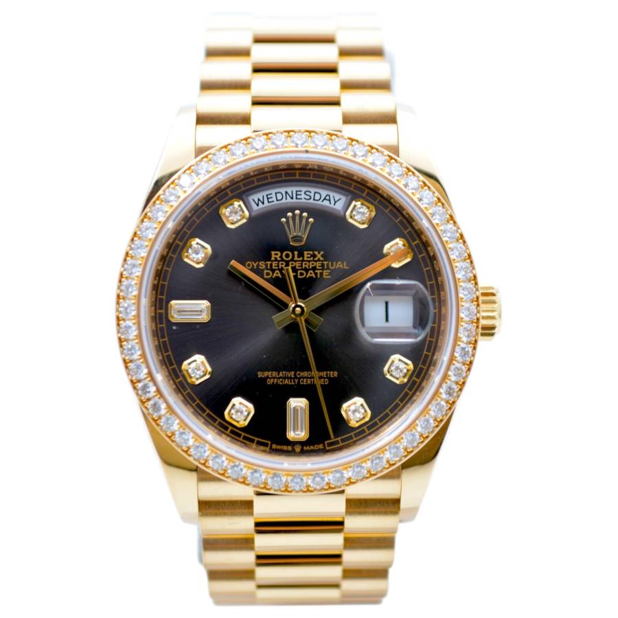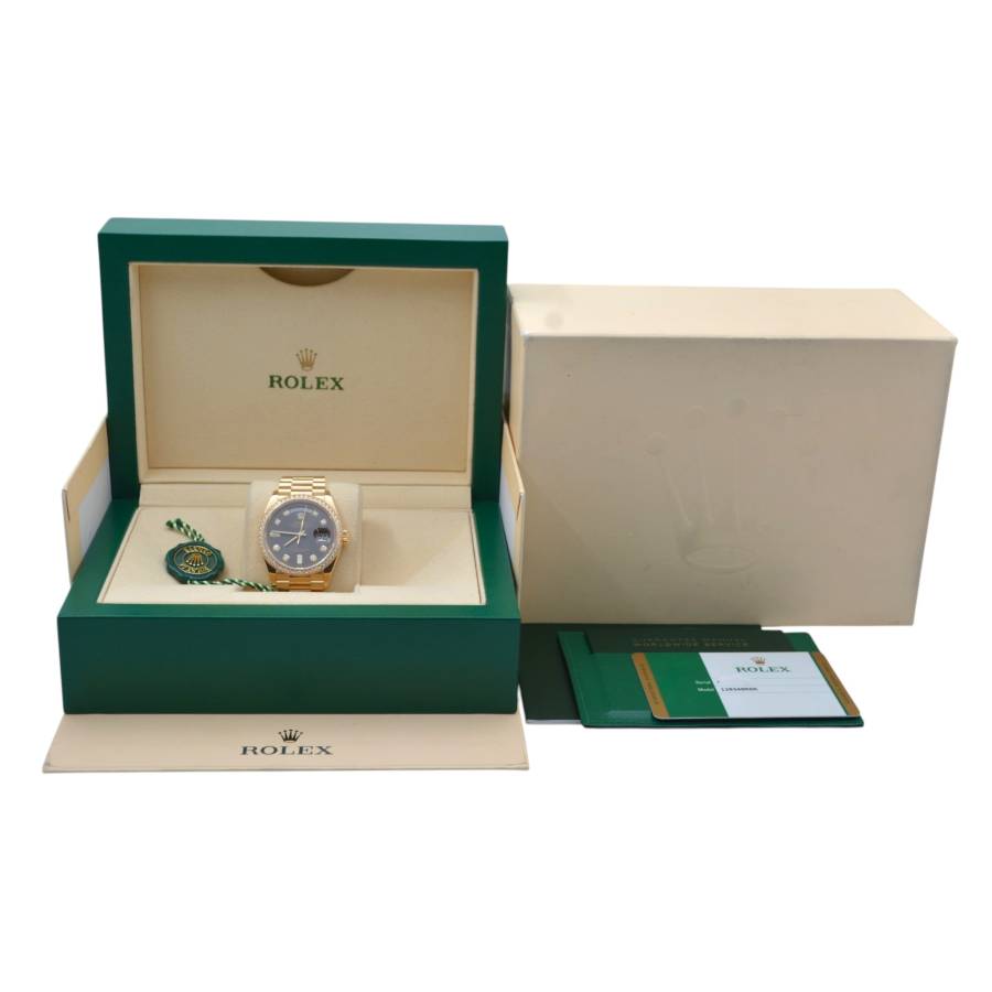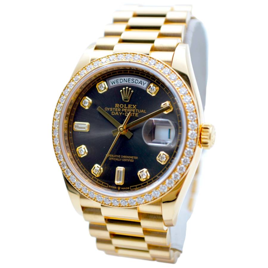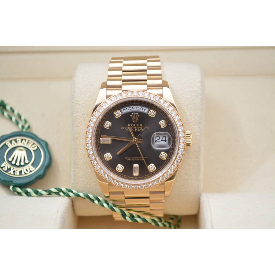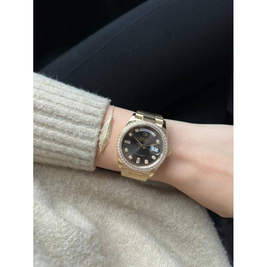 Rolex Day-Date 128348RBR, realizat din aur galben de 18 carate, reprezintă una dintre cele mai rafinate interpretări ale celebrului model elegant al mărcii. Carcasa de 36 mm este completată de brățara President, rezervată exclusiv colecției Day-Date, și de o lunetă încrustată cu diamante, în timp ce cadranul chocolate cu finisaj sunray oferă profunzime și contrast, evidențiat de indicii orari din diamante montați în aur pentru durabilitate și strălucire constantă. În interior, Rolex integrează mecanismul automat calibre 3255, apreciat pentru precizia ridicată, rezerva de mers de aproximativ 70 de ore și afișarea instantanee a zilei și datei scrise integral, semnătura distinctivă a liniei Day-Date. Combinația dintre metal prețios, execuția gemologică și proporțiile clasice transformă referința 128348RBR într-o expresie modernă a renumitului „President’s watch”.