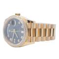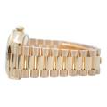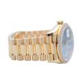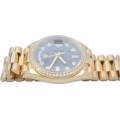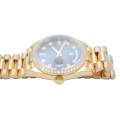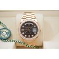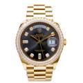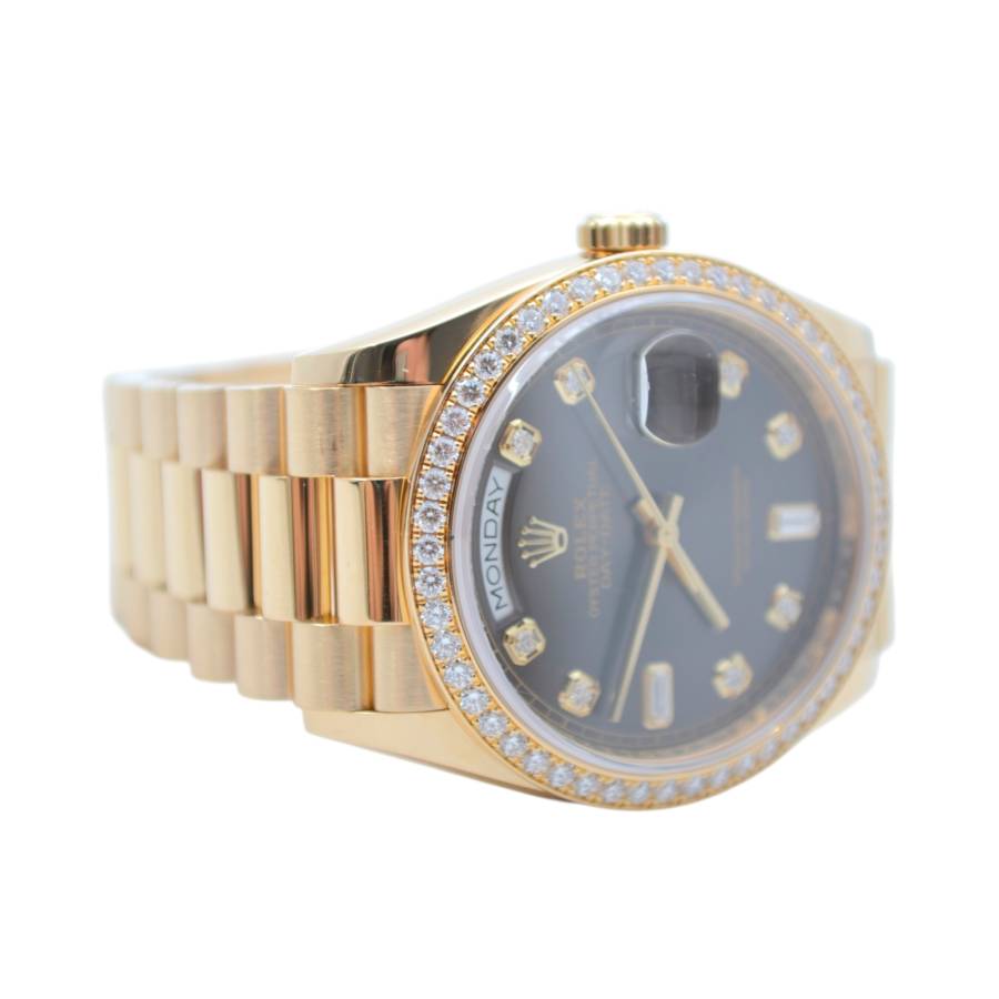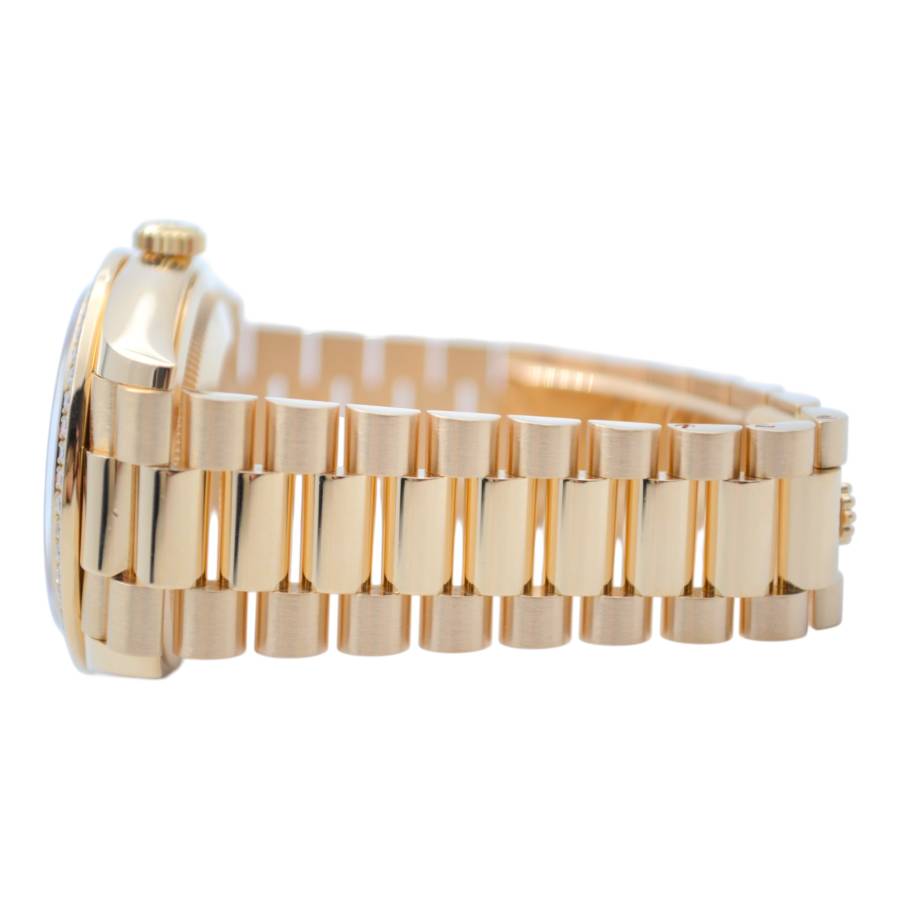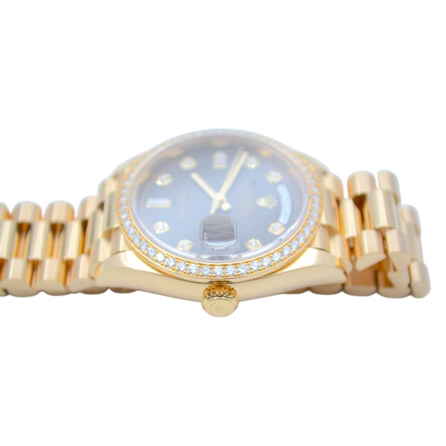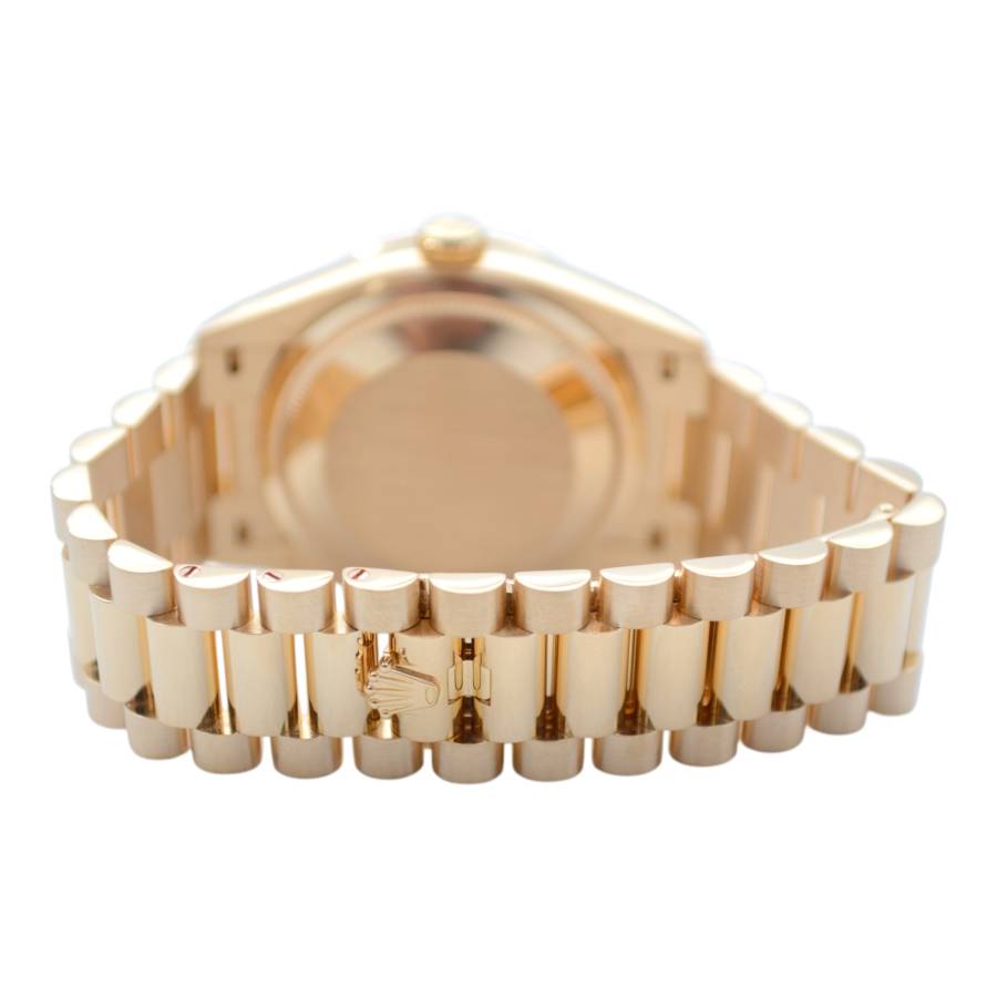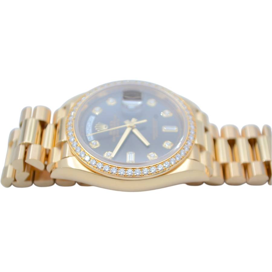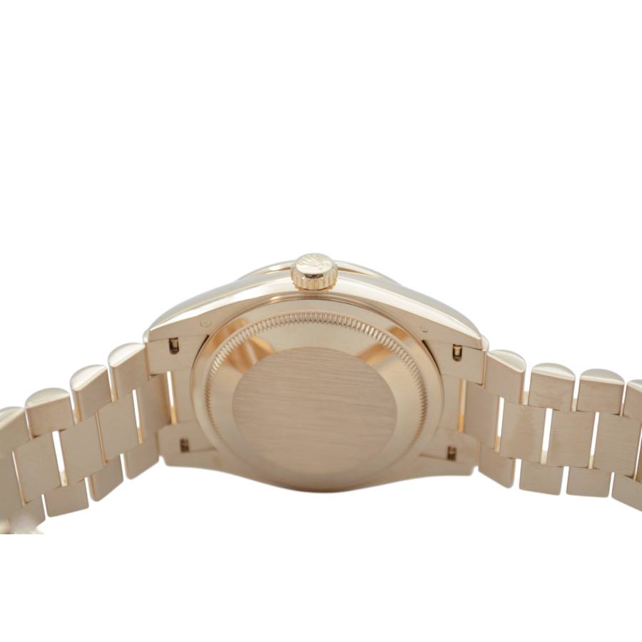 Rolex Day-Date 128348RBR, realizat din aur galben de 18 carate, reprezintă una dintre cele mai rafinate interpretări ale celebrului model elegant al mărcii. Carcasa de 36 mm este completată de brățara President, rezervată exclusiv colecției Day-Date, și de o lunetă încrustată cu diamante, în timp ce cadranul chocolate cu finisaj sunray oferă profunzime și contrast, evidențiat de indicii orari din diamante montați în aur pentru durabilitate și strălucire constantă. În interior, Rolex integrează mecanismul automat calibre 3255, apreciat pentru precizia ridicată, rezerva de mers de aproximativ 70 de ore și afișarea instantanee a zilei și datei scrise integral, semnătura distinctivă a liniei Day-Date. Combinația dintre metal prețios, execuția gemologică și proporțiile clasice transformă referința 128348RBR într-o expresie modernă a renumitului „President’s watch”.