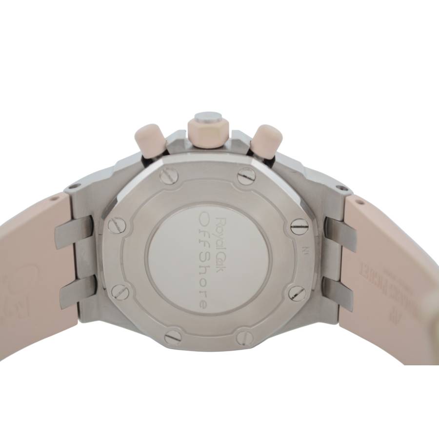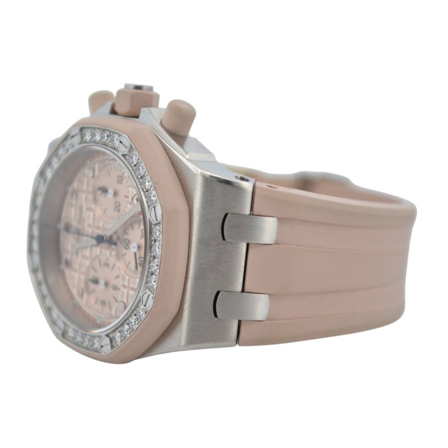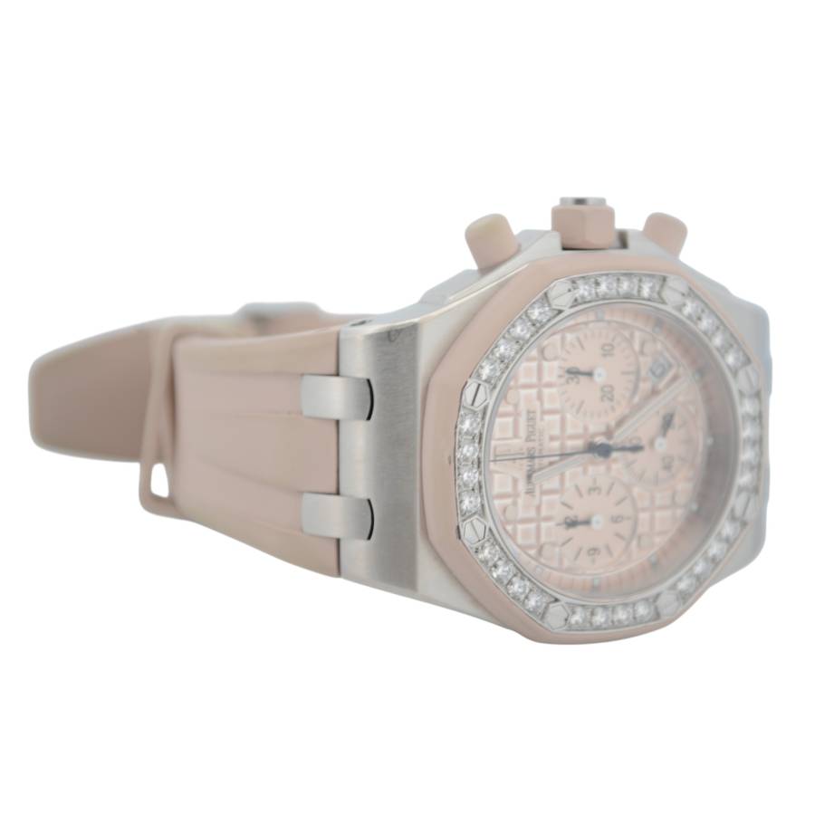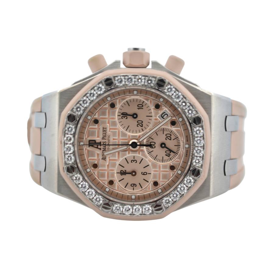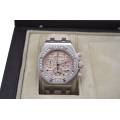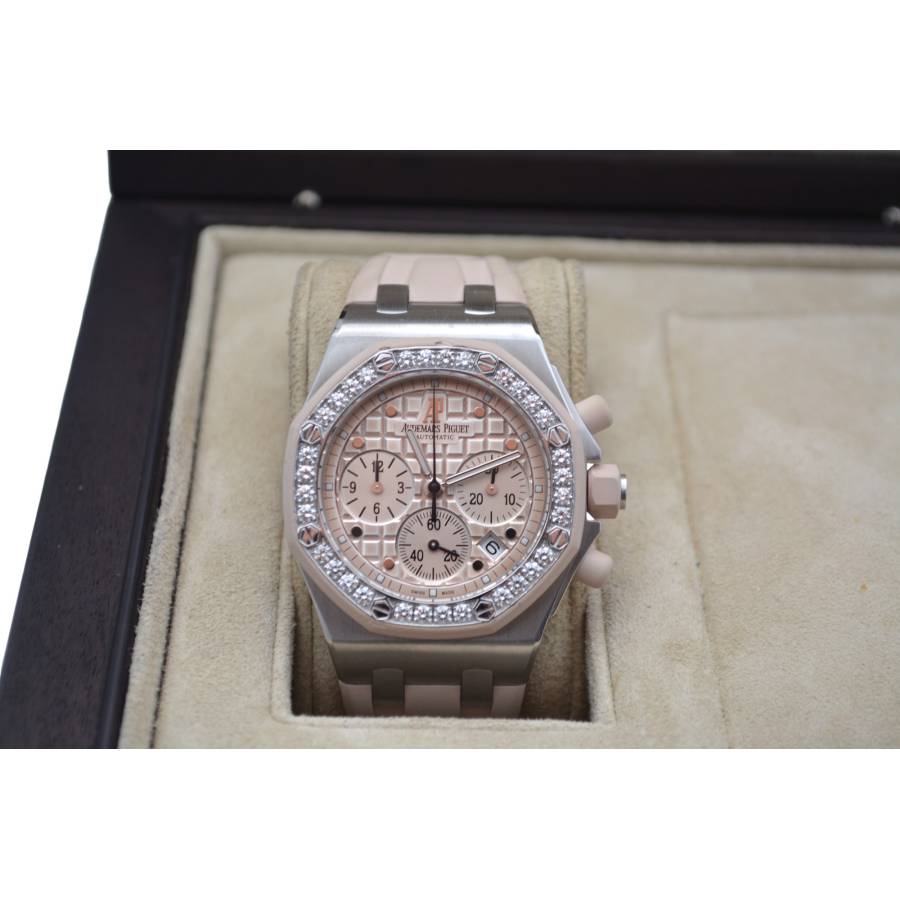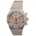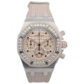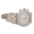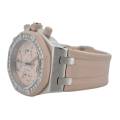 Ceasul Audemars Piguet Royal Oak Offshore Lady Ref. 26048SK.ZZ.D082CA.01 este o fuziune izbitoare între sportivitatea îndrăzneață și eleganța rafinată, creat pentru femeile care îmbrățișează atât forța, cât și sofisticarea. Carcasa sa din oțel inoxidabil de 38 mm este accentuată de o lunetă strălucitoare încrustată cu diamante, adăugând o notă de lux radiant designului emblematic Royal Oak Offshore. Luneta octogonală, împodobită cu 32 de diamante orbitoare, încadrează un cadran bogat în nuanțe de ciocolată, cu modelul caracteristic „Méga Tapisserie” - o emblemă a măiestriei meticuloase a Audemars Piguet.