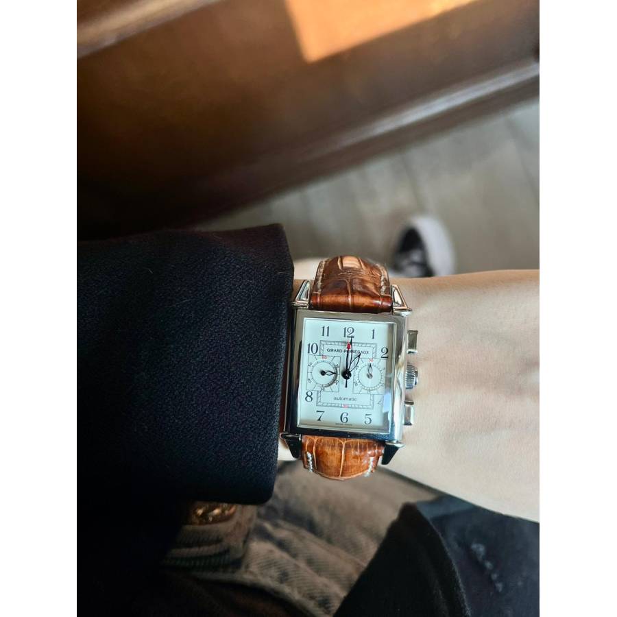 Un tribut adus eleganței atemporale, ceasul Girard-Perregaux Vintage 1945 Chronograph Ref. 25990.0.11.8186 surprinde spiritul erei Art Deco, întruchipând în același timp precizia și rafinamentul orologeriei elvețiene moderne. Carcasa sa dreptunghiulară distinctivă, inspirată de designul original din 1945, prezintă curbe armonioase și suprafețe fin lustruite care reflectă lumina cu o sofisticare discretă. Dispunerea echilibrată a cronografului sporește simetria arhitecturală a cadranului, în timp ce cifrele rafinate și acele subțiri evocă epoca de aur a orologeriei clasice.