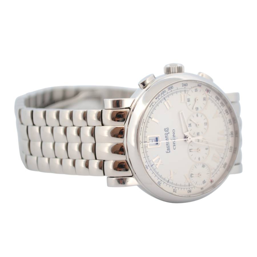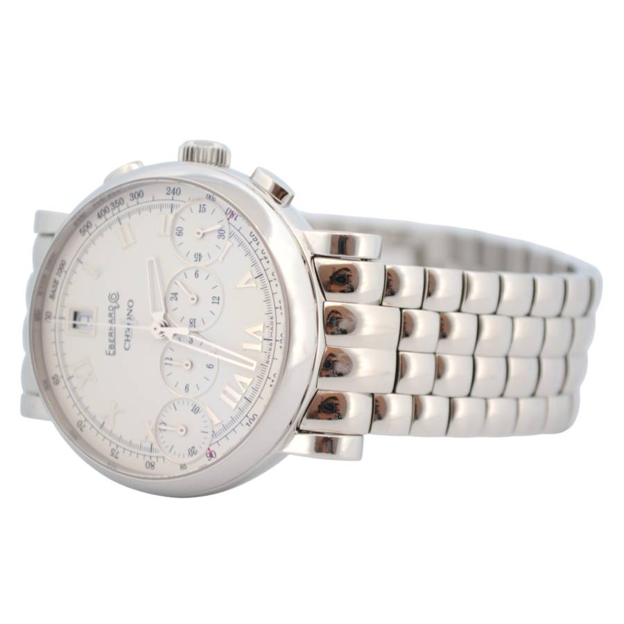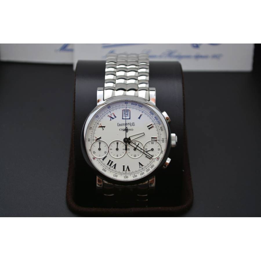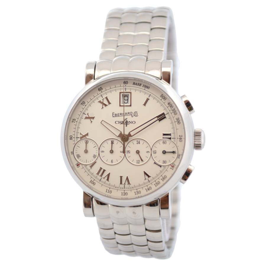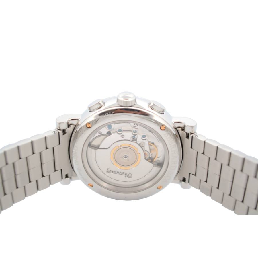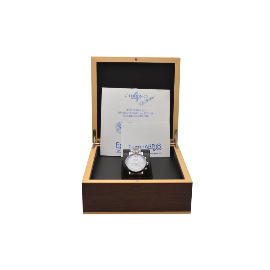 La prima vedere, observați cadranul clasic și echilibrat - cifre romane pe margine, o dată încadrată la ora 12 și, dedesubt, cele patru contoare cronografe iconice, aranjate într-un singur rând. Această configurație „Chrono 4” este o semnătură patentată Eberhard și este cea care a făcut colecția celebră atunci când a debutat în 2001, ca primul cronograf care aliniază toate sub-cadranele pe o singură linie.