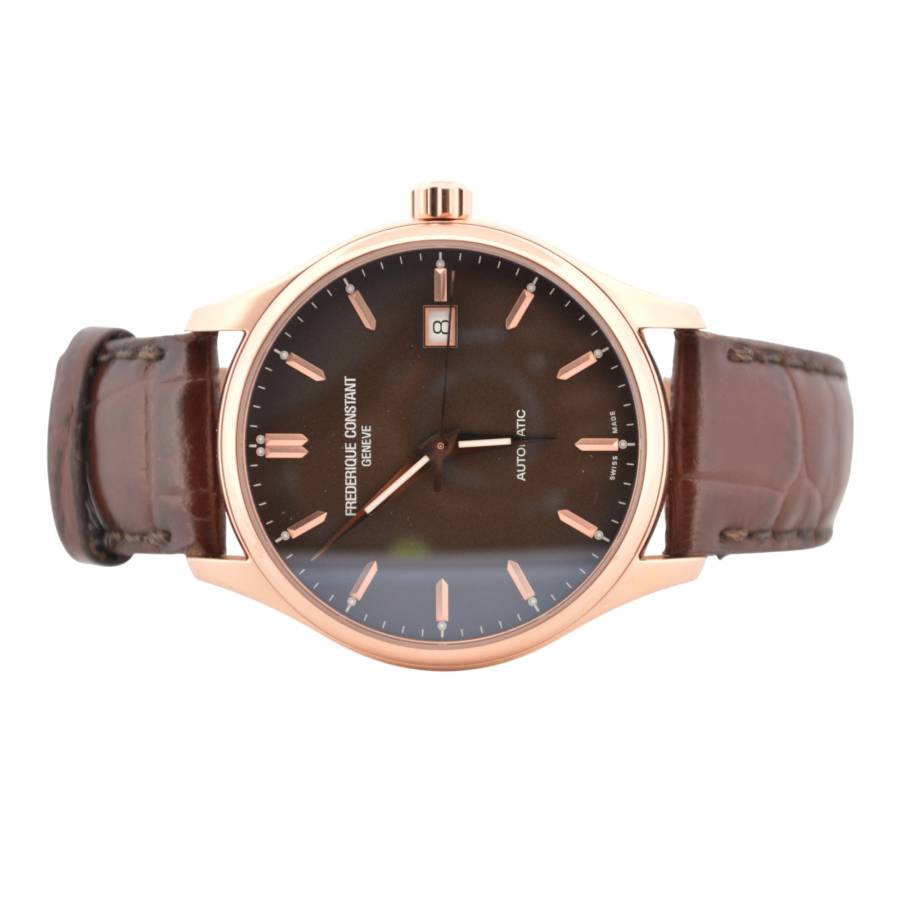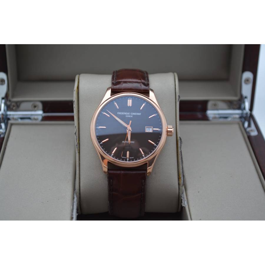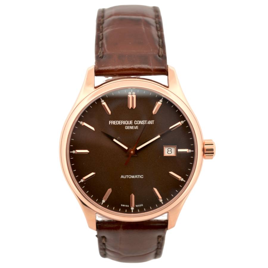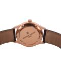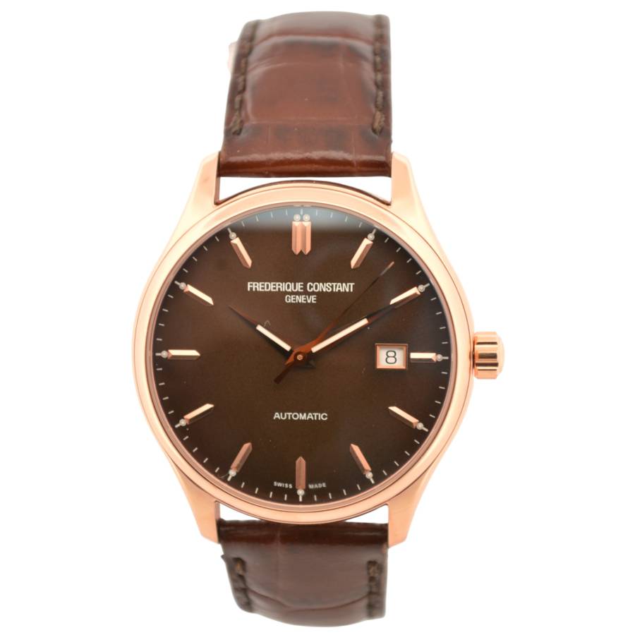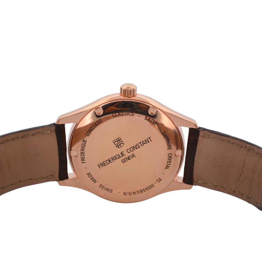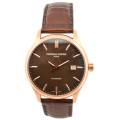 Ceasul Frédérique Constant Index Classics Ref. FC-303C5B4 este o întruchipare atemporală a eleganței elvețiene, creată pentru cei care apreciază sofisticarea discretă. Carcasa sa din oțel inoxidabil lustruit, de 40 mm, cu strat PVD auriu-roz, radiază căldură și rafinament, completate perfect de o curea bogată din piele maro închis, cu cusături contrastante, evocând tradițiile orologeriei clasice. Cadranul maro, accentuat de un finisaj sunray, oferă un aspect armonios cu indecși placați cu aur-roz aplicați și ace în stil dauphine, asigurând o lizibilitate fără efort. O apertură discretă pentru dată, la ora 3, adaugă funcționalitate practică fără a perturba simetria elegantă a cadranului.