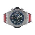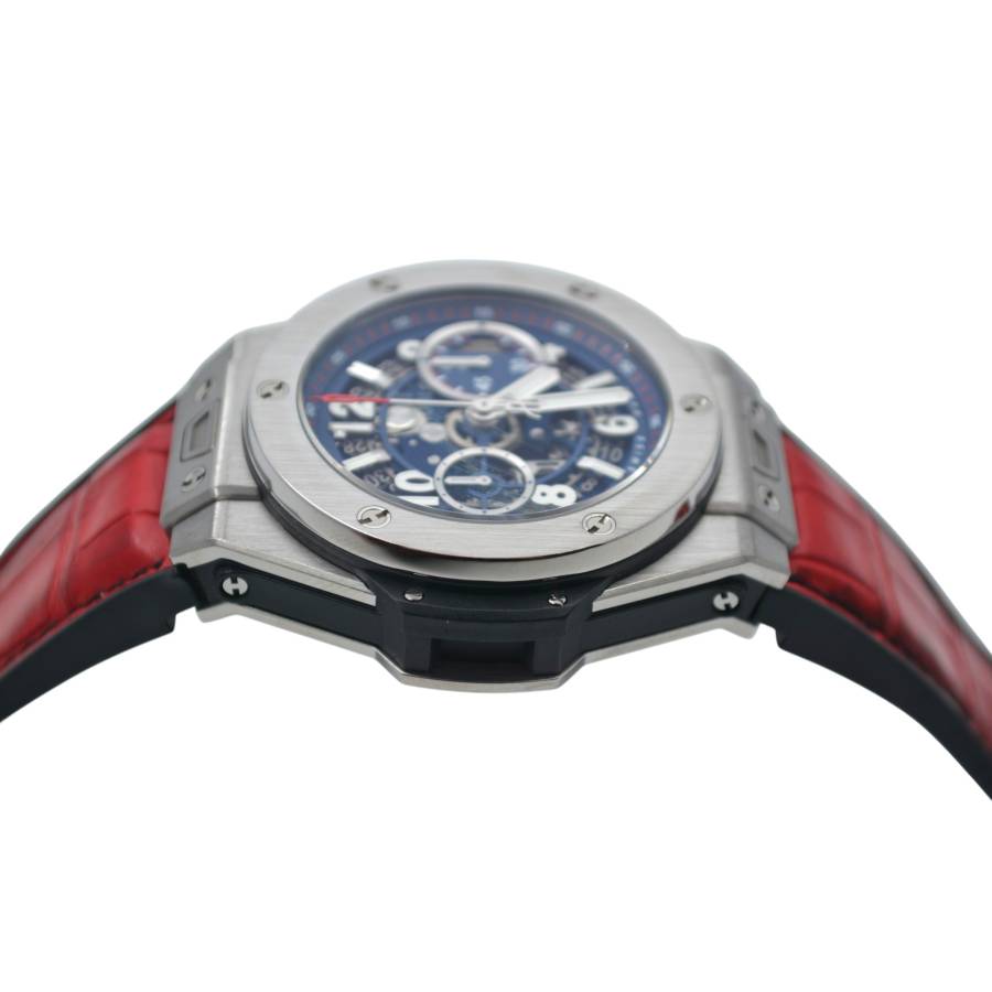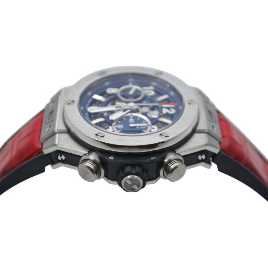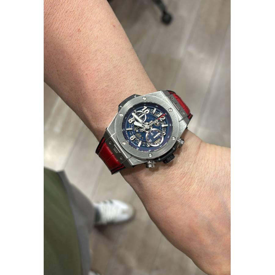 Există ceasuri... și apoi există declarații de identitate. Hublot Big Bang Unico Blue Ref. 411.NX.5179.RX aparține, fără îndoială, celor din urmă. Forjată din titan ușor, dar rezistent, carcasa sa de 45 mm se simte ca o piesă de arhitectură modernă la încheietura mâinii - precisă, încrezătoare, necondiționat de contemporană. Suprafețele satinate și lustruite surprind lumina în contraste subtile, reflectând o filozofie de design înrădăcinată în faimoasa „Artă a Fuziunii” a Hublot.