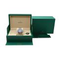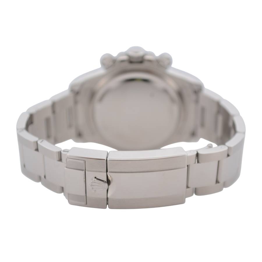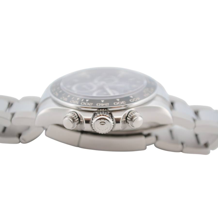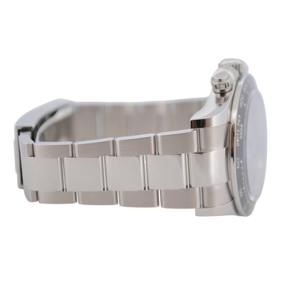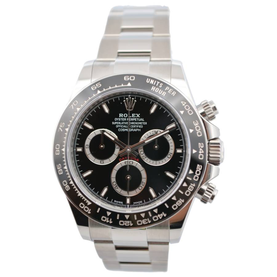 Ceasul Rolex Cosmograph Daytona 126500LN (cadran negru) are o carcasă de 40 mm din oțel integral, îmbinând moștenirea sporturilor de curse a Rolex cu rafinamente moderne. Este echipat cu o ramă fixă din ceramică neagră Cerachrom, gravată cu scară tahimetrică (acoperită cu platină prin PVD) pentru măsurarea vitezei medii. Cadranul este de un negru intens, cu sub-cadrane încadrate în oțel, marcaje orare aplicate din aur alb de 18 ct și indicatoare acoperite cu Chromalight pentru luminiscență albastră, oferind vizibilitate optimă în condiții de lumină scăzută. În interior funcționează calibrul intern 4131, un mecanism cronograf cu roată-coloană și ambreiaj vertical, echipat cu spirală Parachrom, amortizoare Paraflex și o rezervă de mers de aproximativ 72 de ore. Carcasa din Oystersteel este etanșă până la 100 de metri și este completată de brățara Oyster (trei zale masive), prevăzută cu închizătoare de siguranță Oysterlock și extensie confort Easylink de 5 mm. Designul general a fost subtil actualizat în 2023: indicatoare și marcaje orare mai subțiri, spațiere mai aerisită a cadranului și ergonomie îmbunătățită pentru brățară și capetele acesteia.