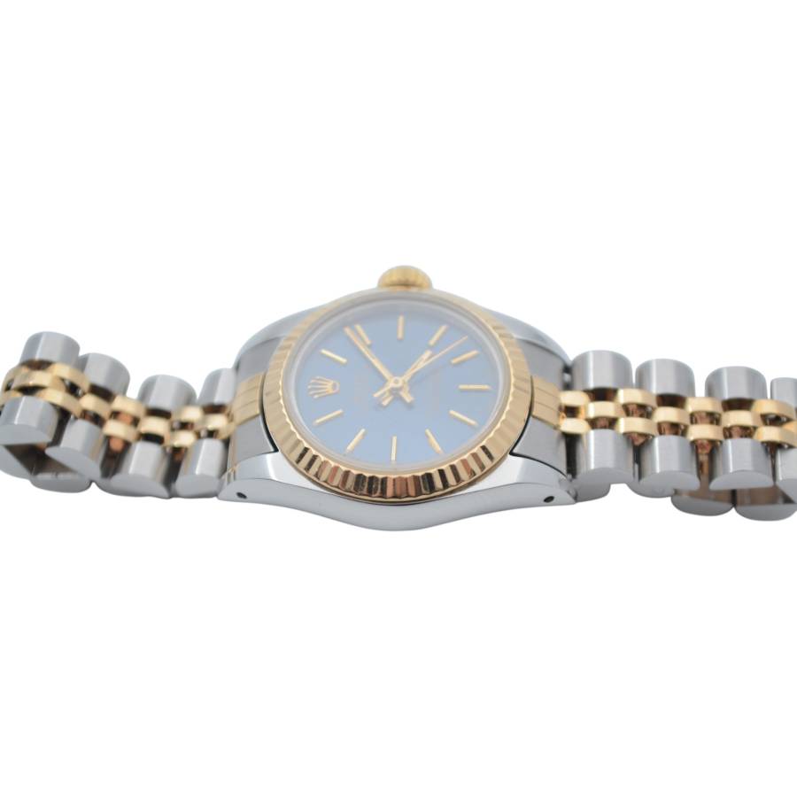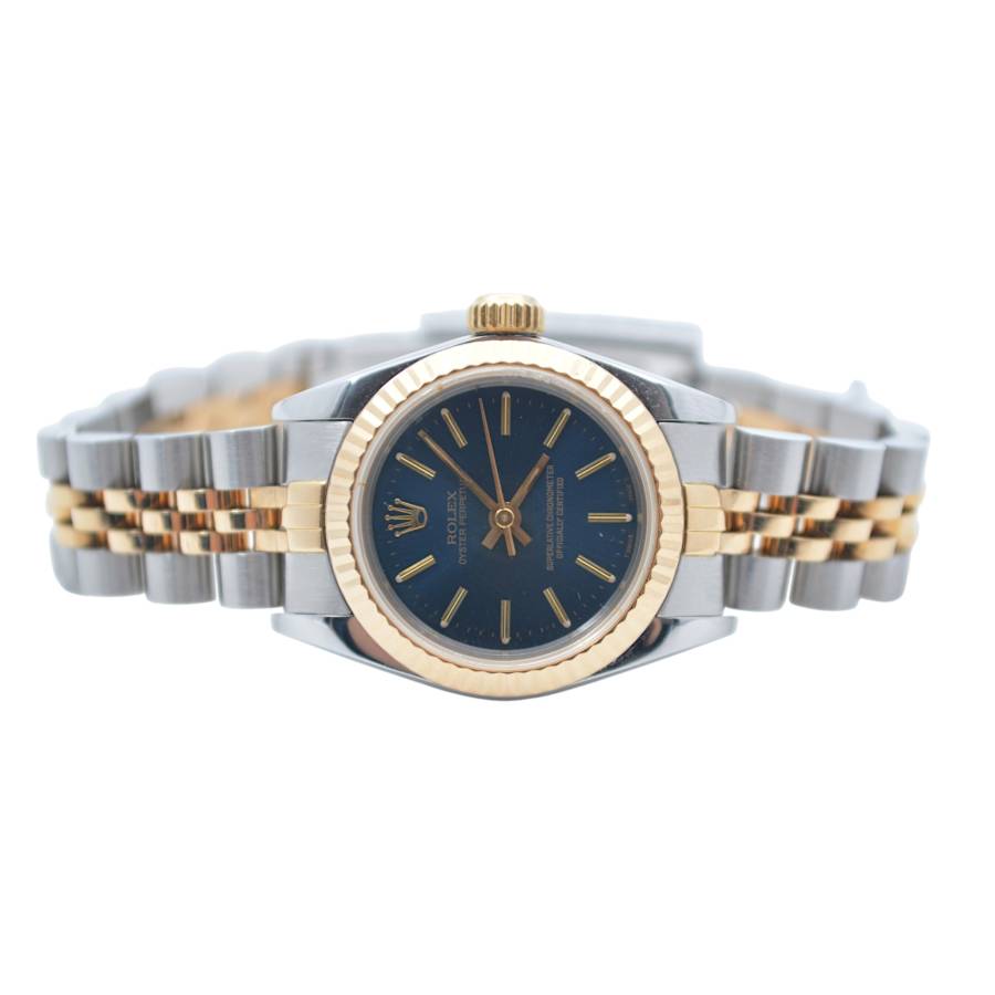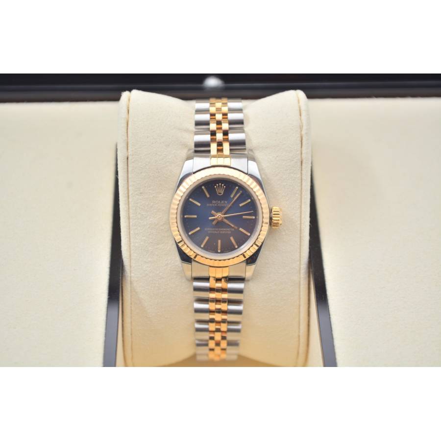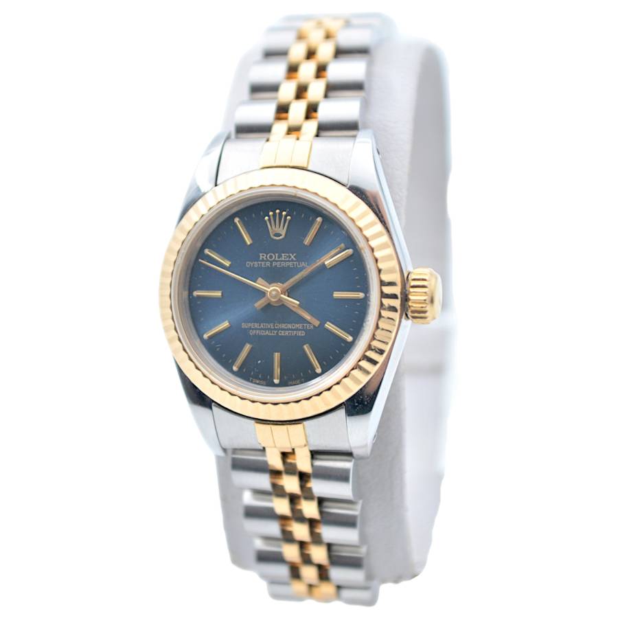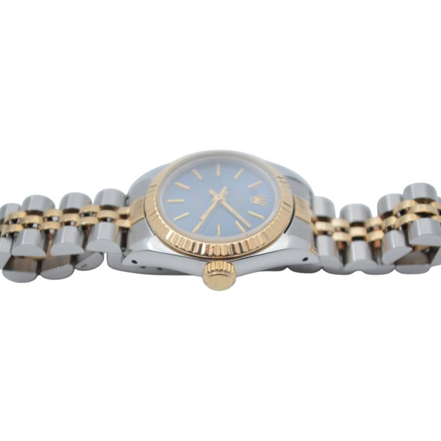 Rolex Oyster Perpetual Lady Ref. 67193 este o expresie grațioasă a feminității atemporale, unde estetica rafinată întâlnește precizia orologeriei elvețiene. Conceput pentru cei care apreciază luxul subtil, acest ceas elegant surprinde esența stilului clasic cu o prezență delicată, dar încrezătoare. Fabricat într-un amestec armonios de oțel inoxidabil și aur galben de 18k, construcția iconică Rolesor aduce căldură și rafinament încheieturii mâinii. Luneta fin canelată, strălucind la fiecare mișcare, reflectă lumina cu o strălucire discretă - o semnătură inconfundabilă a eleganței Rolex.