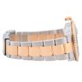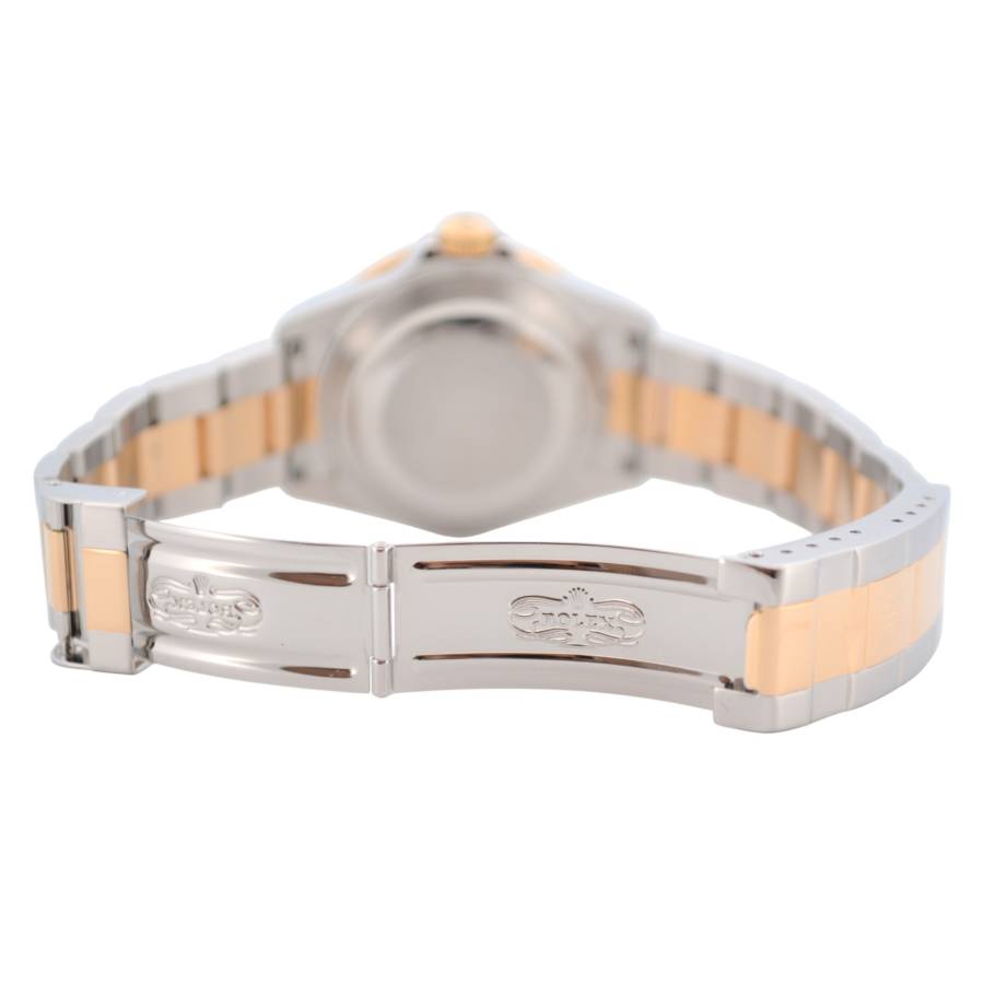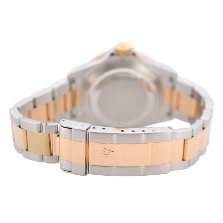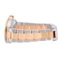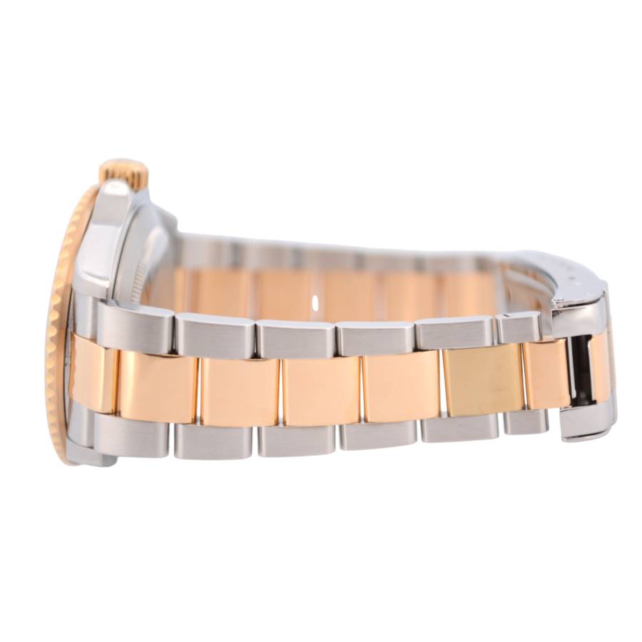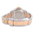În proporții clasice de 40 mm, carcasa Oyster combină oțelul inoxidabil robust cu aurul galben cald de 18k, creând acel aspect bicolor inconfundabil pe care Rolex îl numește Rolesor. Ceasul este încadrat de o lunetă rotativă unidirecțională de un albastru intens, cu o scală de scufundare aurie de 60 de minute gravată în inserția de aluminiu - un detaliu pe care colecționarii îl adoră pentru caracterul său vintage în comparație cu ceramica modernă.