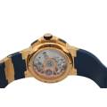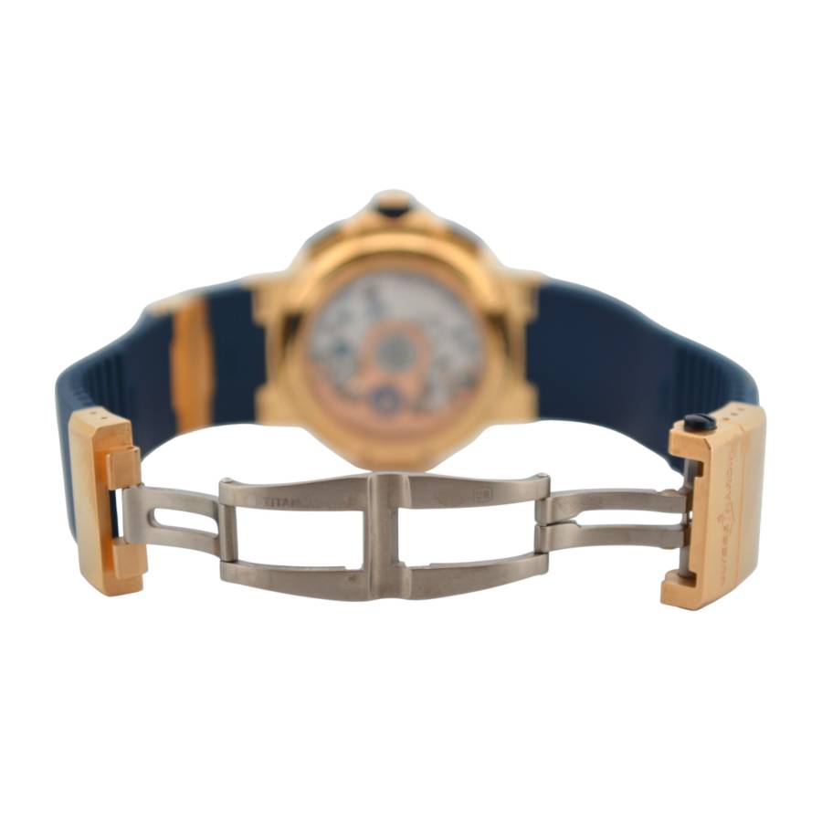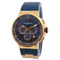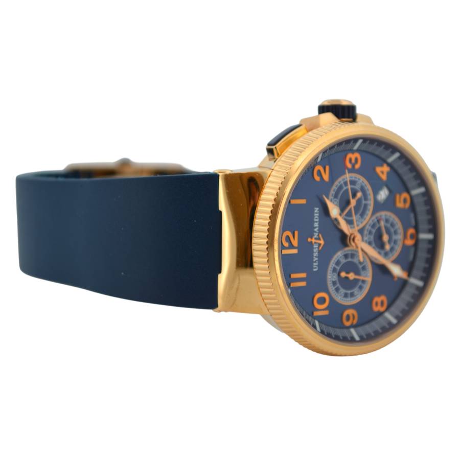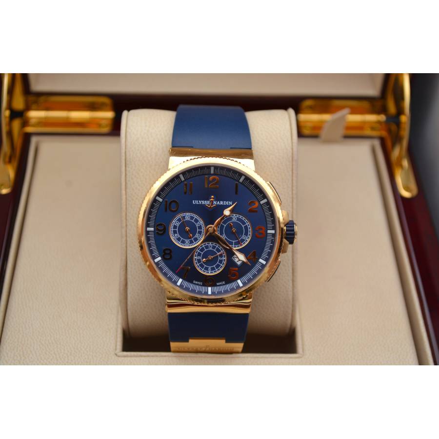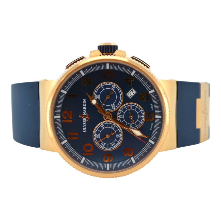 Cronograful Marine Manufacture Ref. 1506-150-3/63 de la Ulysse Nardin reprezintă locul unde moștenirea marină clasică întâlnește luxul modern fără pretenții. Adăpostit într-o carcasă îndrăzneață de 43 mm, realizată din aur roz de 18K, această piesă are o prezență reală la încheietura mâinii, rămânând în același timp elegant proporționată. Cadranul albastru intens - inspirat de culoarea apelor deschise - este adus la viață de cifrele arabe aurii aplicate și de registrele cronografe fin detaliate, toate aranjate cu claritatea unui instrument autentic.