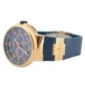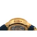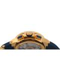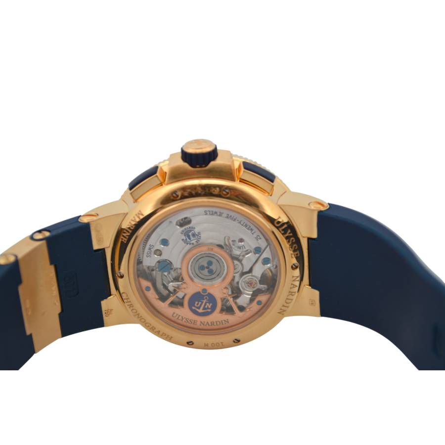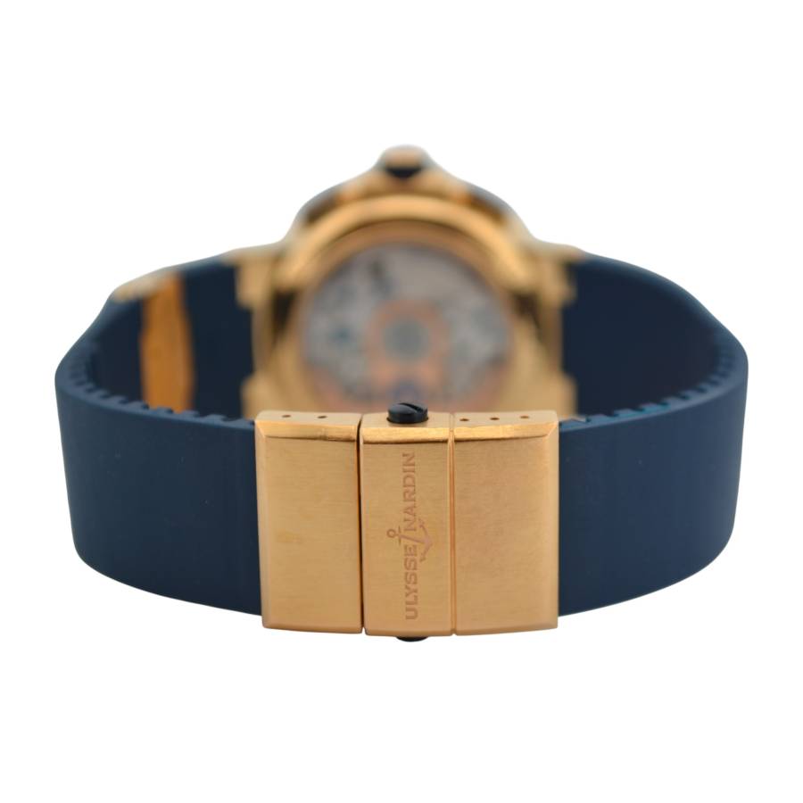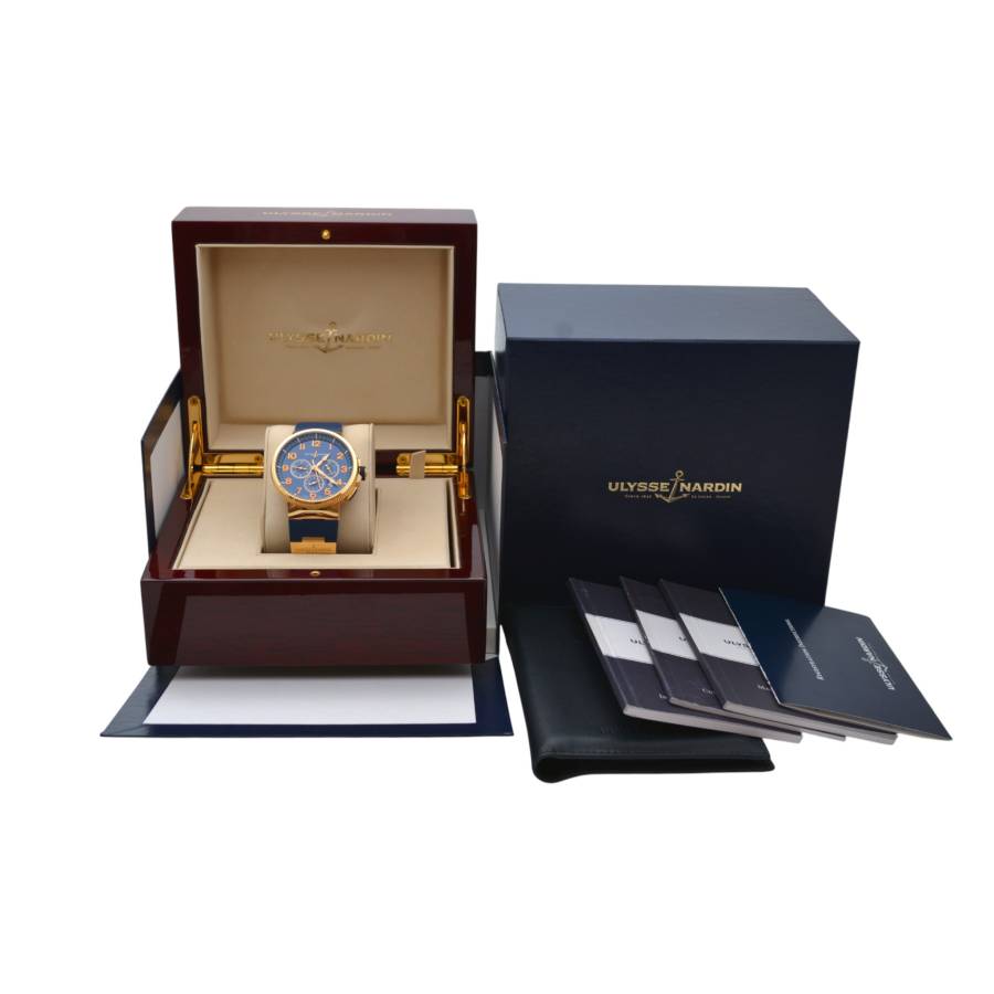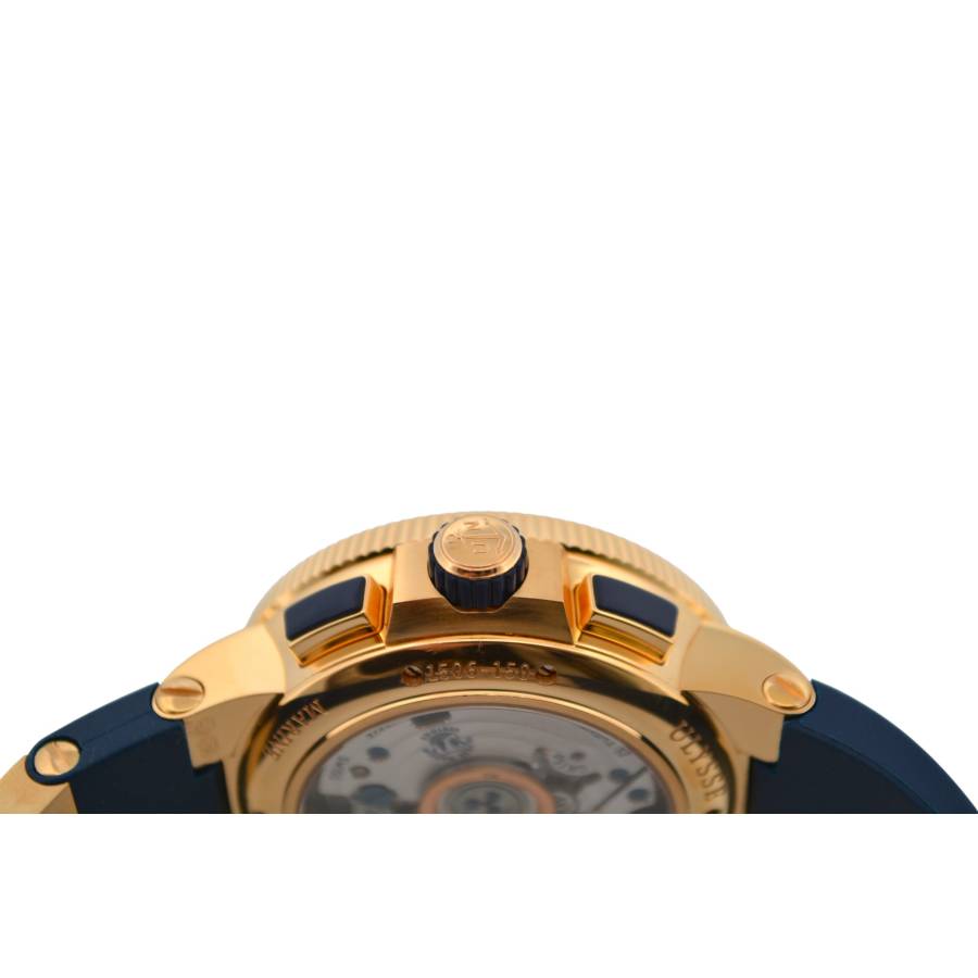 Cronograful Marine Manufacture Ref. 1506-150-3/63 de la Ulysse Nardin reprezintă locul unde moștenirea marină clasică întâlnește luxul modern fără pretenții. Adăpostit într-o carcasă îndrăzneață de 43 mm, realizată din aur roz de 18K, această piesă are o prezență reală la încheietura mâinii, rămânând în același timp elegant proporționată. Cadranul albastru intens - inspirat de culoarea apelor deschise - este adus la viață de cifrele arabe aurii aplicate și de registrele cronografe fin detaliate, toate aranjate cu claritatea unui instrument autentic.