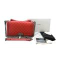 Geanta Chanel Boy este o icoană a eleganței moderne, îmbinând perfect designul îndrăzneț cu șicul parizian atemporal. Acest model particular, realizat din piele de vițel matlasată de un roșu vibrant, radiază încredere și sofisticare, fiind piesa perfectă pentru orice colecție. Silueta sa structurată este evidențiată de matlasarea cu romburi, semnătură Chanel, încadrată de detalii complexe de lanț care adaugă o notă contemporană. Accesoriile metalice în nuanțe argintii învechite sporesc caracterul îndrăzneț al genții, în timp ce încuietoarea iconică Boy cu logo-ul CC interconectat o ancorează ca o adevărată emblemă a moștenirii Casei. Versatilă ca stil, geanta Boy poate fi purtată cu curea groasă din lanț pentru un aspect modern crossbody sau purtată elegant de mânerul superior pentru o notă de rafinament. De la debutul său în 2011, geanta Chanel Boy a devenit un simbol al spiritului tineresc și al luxului atemporal - o completare îndrăzneață a esteticii clasice Chanel.