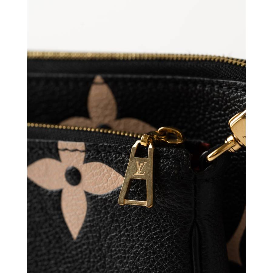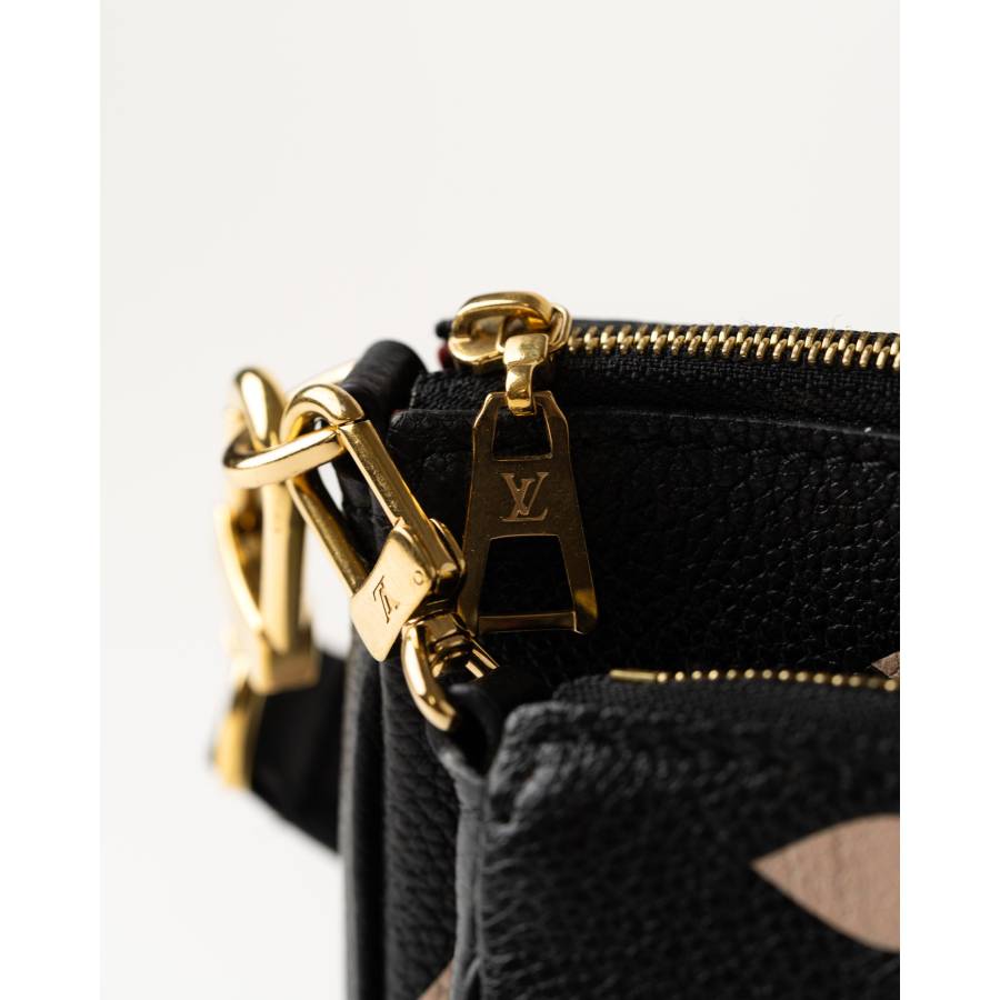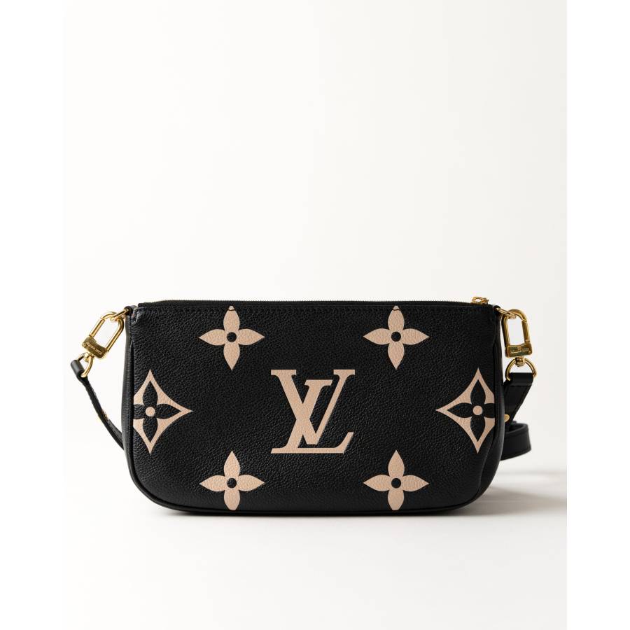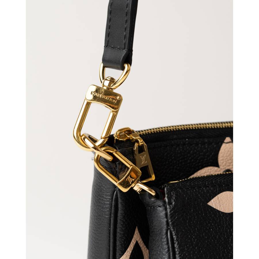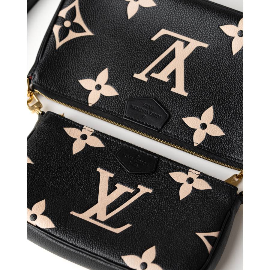 O piesa moderna reinterpretata in luxosul Monogram Empreinte din piele, Louis Vuitton Multi Pochette Accessoires ofera atat versatilitate, cat si eleganta. Realizata din piele granulata neagra si fina, geanta este decorata cu motive Monogram supradimensionate in bej, creand un contrast remarcabil, atemporal si contemporan in acelasi timp. Acest design multifunctional include doua plicuri detasabile – un pochette principal spatios si un plic frontal mai mic – oferind posibilitati infinite de stilizare. Accesoriile metalice aurii, inclusiv fermoarele gravate cu logo-ul LV, adauga o nota de glamour, iar cureaua reglabila din piele asigura confort atat purtata crossbody, cat si pe umar.