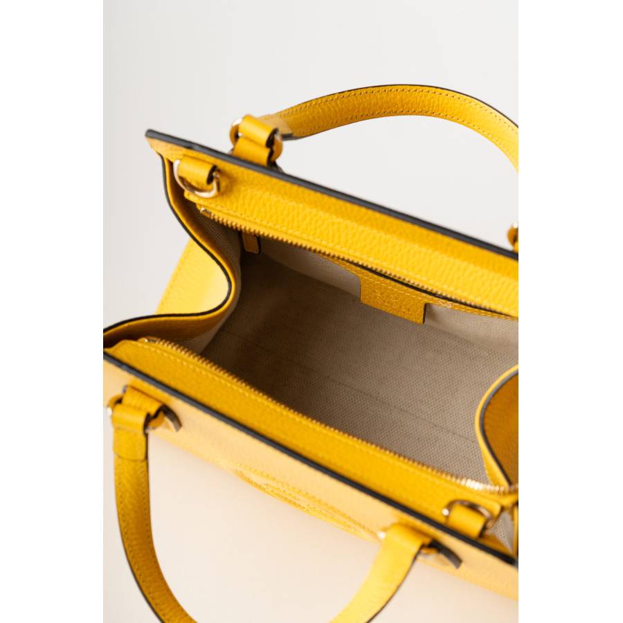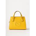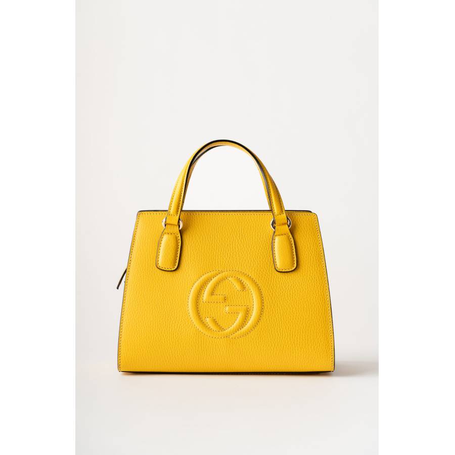 Geanta de mână din piele Gucci Soho cu mâner superior în galben este o piesă elegantă și modernă, care prezintă luxul atemporal Gucci. Geanta este fabricată din piele moale, granulată, care îi conferă o textură bogată și durabilitate. Caracteristica remarcabilă a acestui model este emblematica GG în relief pe față, care adaugă o notă semnătură de sofisticare. Geanta este realizată din piele granulată de înaltă calitate, cunoscută pentru textura netedă și durabilitate. Culoarea galbenă îi conferă un aspect proaspăt, vibrant, perfect pentru a face o declarație îndrăzneață de modă. Această geantă de mână are o siluetă structurată, oferind atât stil, cât și funcționalitate. Mânerele superioare sunt robuste și confortabil de ținut, în timp ce cureaua de umăr detașabilă permite transportul ușor fără mâini, adăugând versatilitate designului său. Geanta are o închidere sigură cu fermoar pentru a vă păstra lucrurile esențiale în siguranță. Liniile curate și structura minimalistă a genții îi conferă un aspect sofisticat și șic.