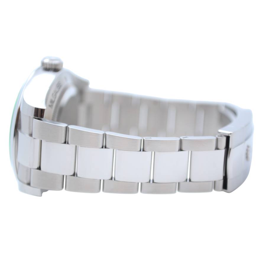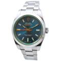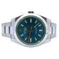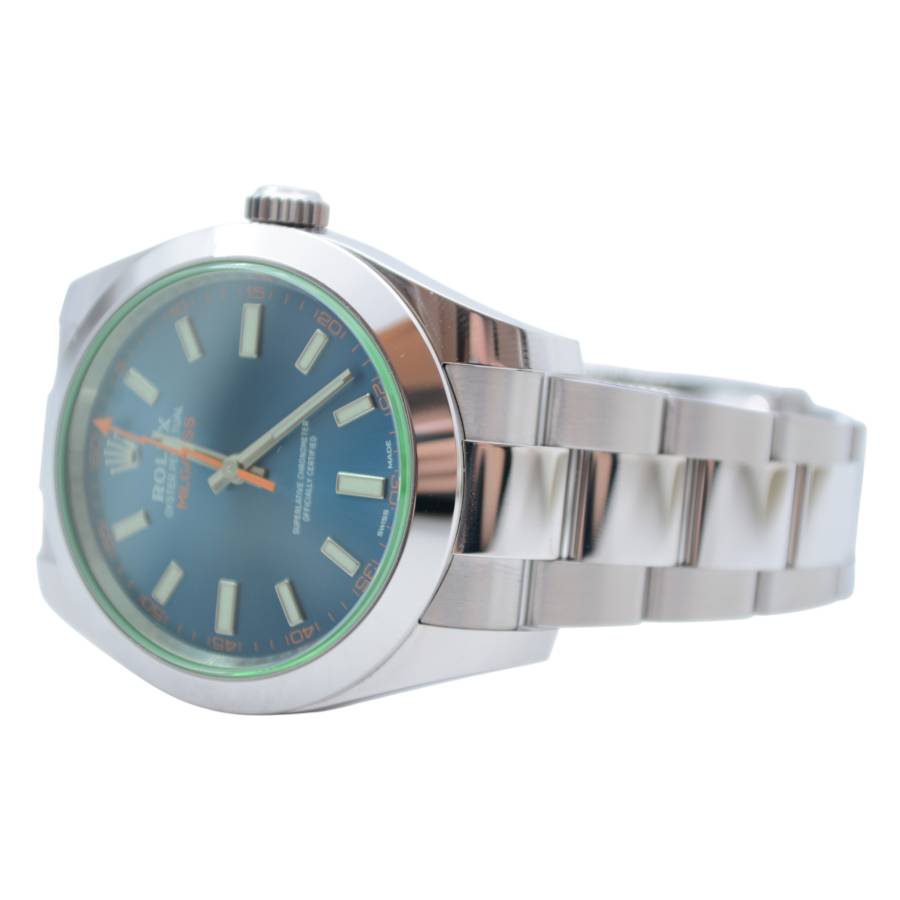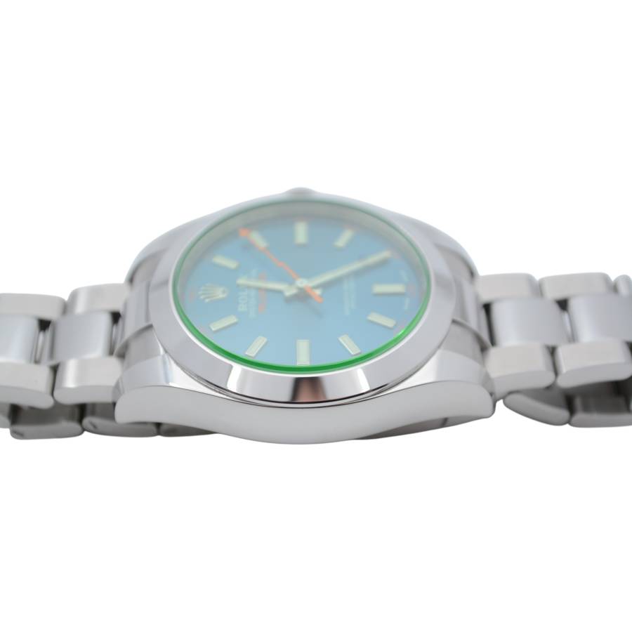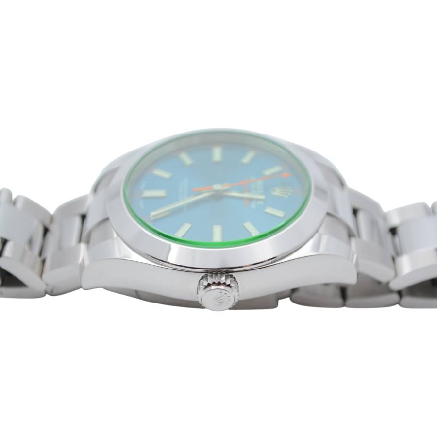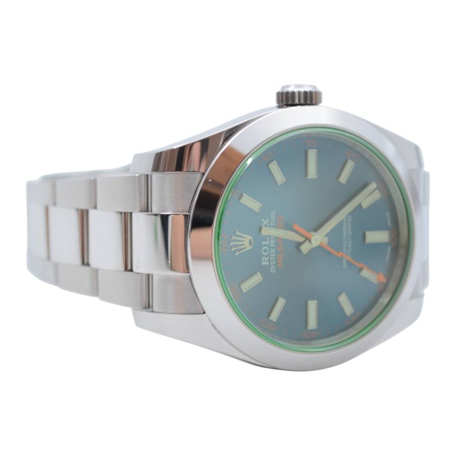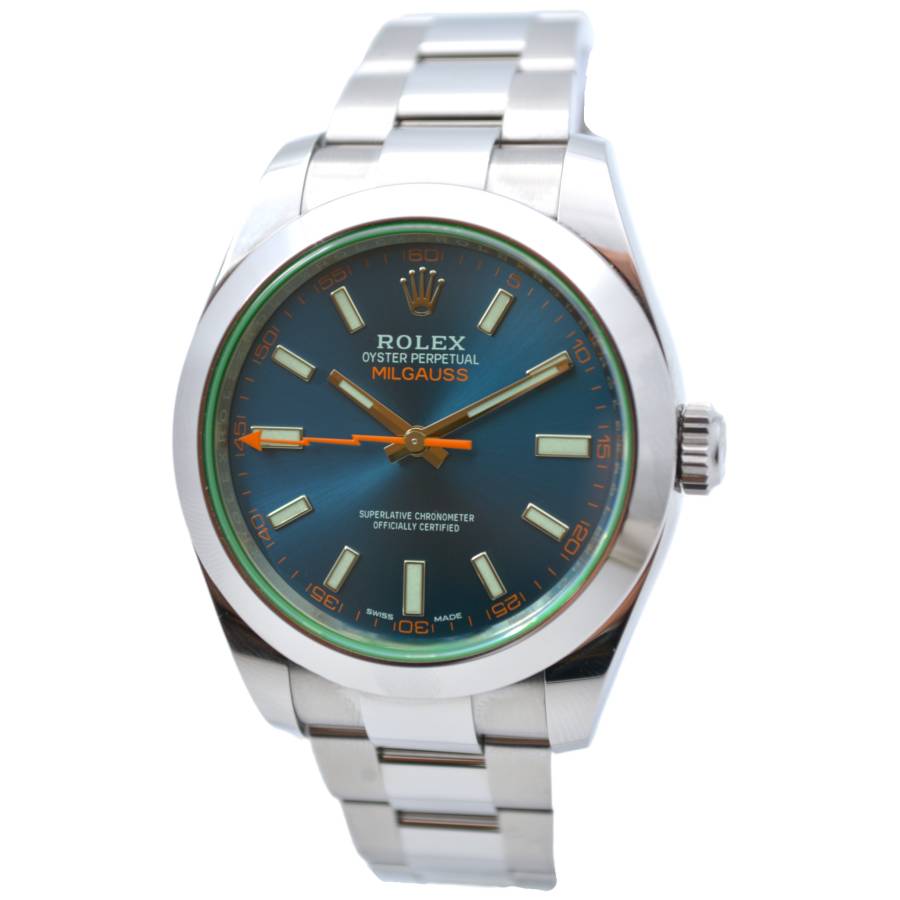 Născut din fuziunea dintre știință și lux, Rolex Milgauss Ref. 116400GV este un ceas cu un suflet la fel de îndrăzneț precum scopul său. Creat de Rolex pentru oameni de știință și pionieri, Milgauss a fost proiectat să reziste câmpurilor magnetice de până la 1.000 gauss - totuși, nu a sacrificat niciodată eleganța în favoarea performanței. Semnătura sa cea mai fascinantă este emblematicul cristal de safir verde (Glace Verte), o inovație Rolex rară și exclusivă, care aruncă o strălucire subtilă, aproape electrică, asupra cadranului. Sub ea se află o pânză neagră intensă, punctată de indexuri orare luminoase și de inconfundabilul secundar portocaliu în formă de fulger, un omagiu jucăuș adus electricității și descoperirii științifice.