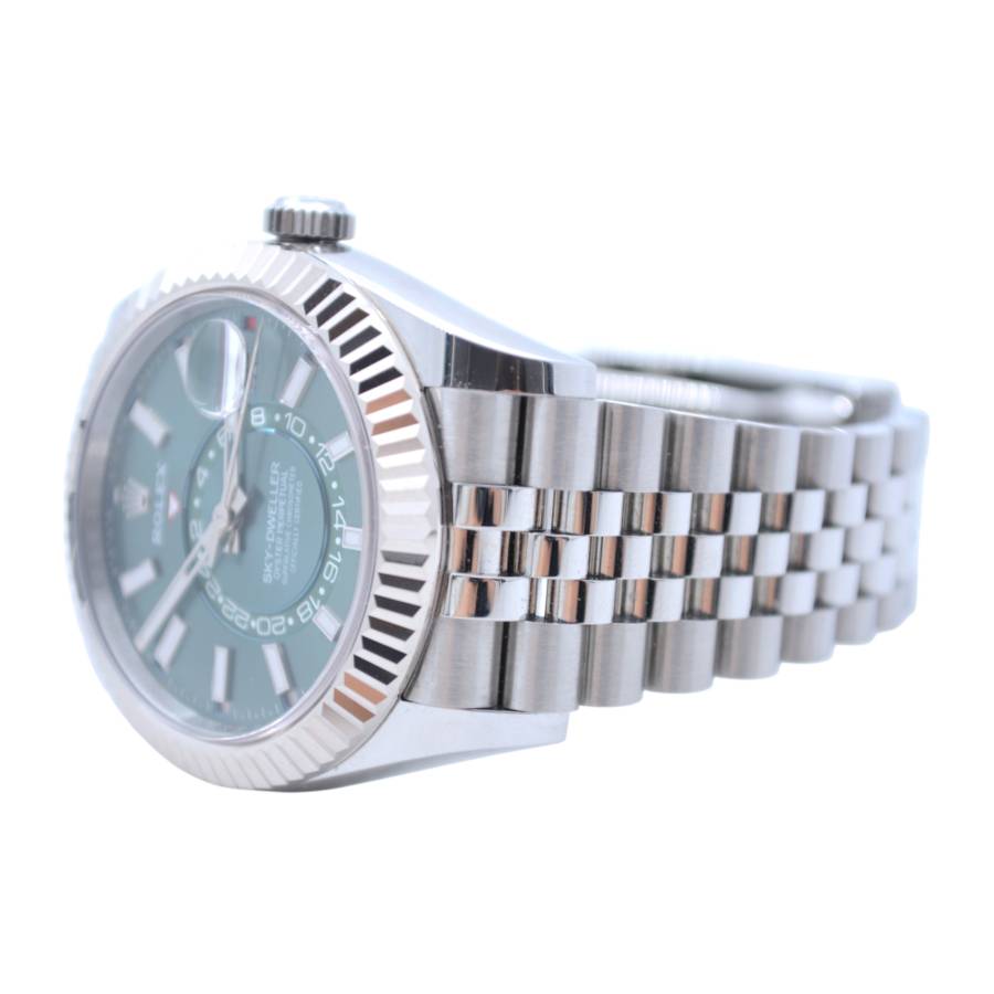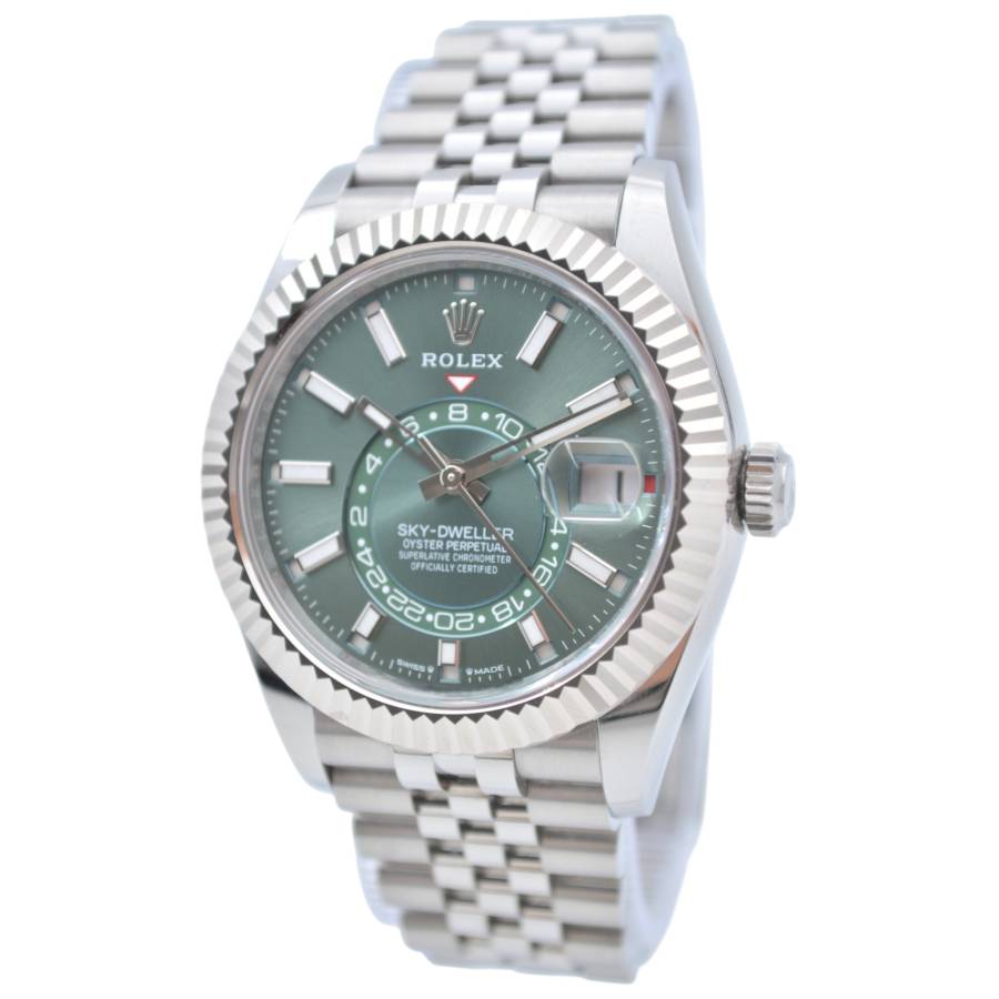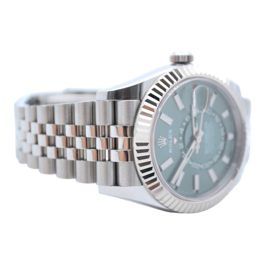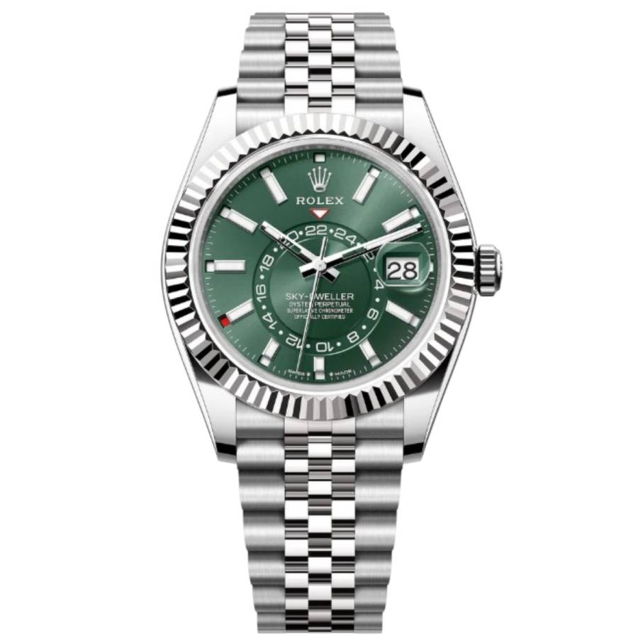Rolex Sky-Dweller Ref. 336934 în verde mentă reprezintă locul unde prospețimea modernă întâlnește autoritatea atemporală - o expresie rară a eleganței, care se simte atât îndrăzneață, cât și rafinată fără efort. Cadranul său, scăldat într-un verde mentă moale, dar vibrant, surprinde lumina într-un mod care pare viu - subtil în nuanțe, dar inconfundabil de distinctiv. Este o culoare care evocă claritate, încredere și individualitate, diferențiind acest Sky-Dweller de obișnuit, fără a-și pierde vreodată calmul.